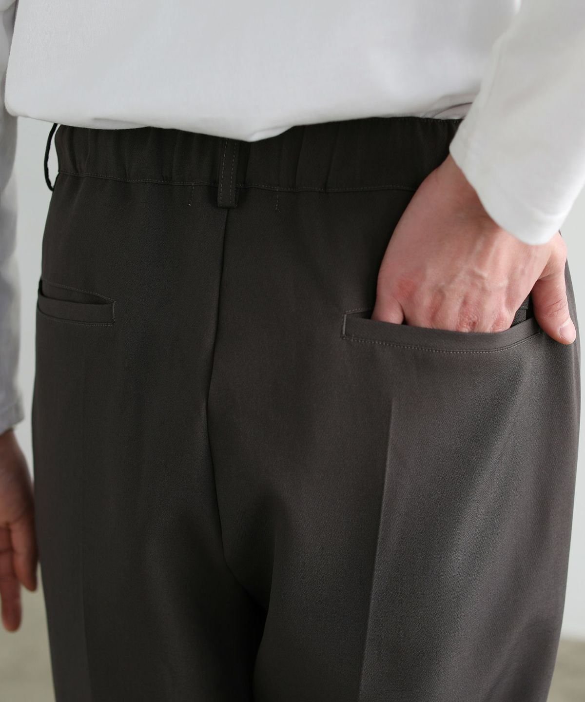 ウエスト内側には紐、後ろゴム仕様で、キレイめながらラクな履き心地のアイテムです。