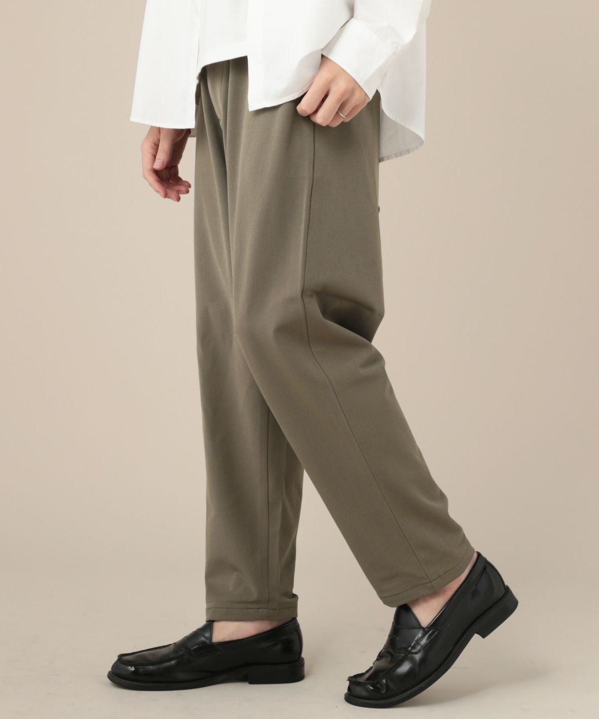 股上が深く、上品なドレープ感が特徴のサルエルシルエットを採用。膝下にかけて細くなるテーパードが加えられているため、もたつくことなくスッキリと着こなせます。また、ウエストにはゴムが入っており、調節可能なヒモも付いていますので、幅広い体型で着用が可能です。