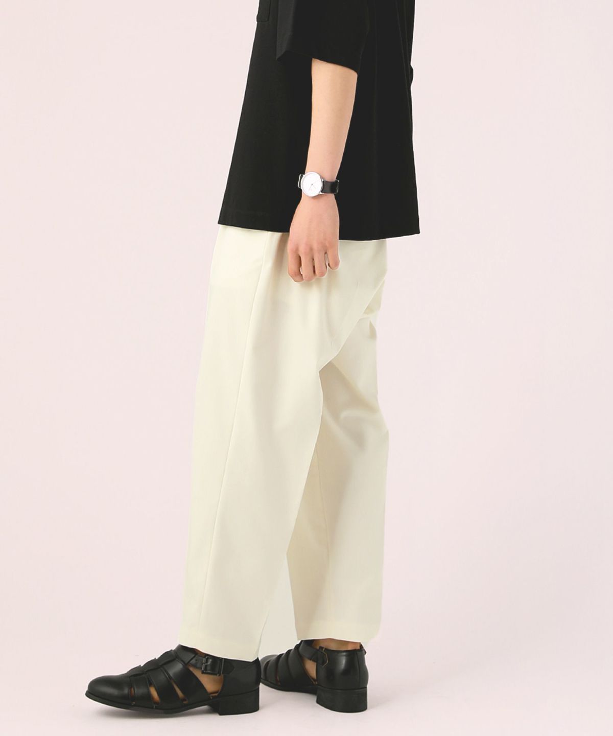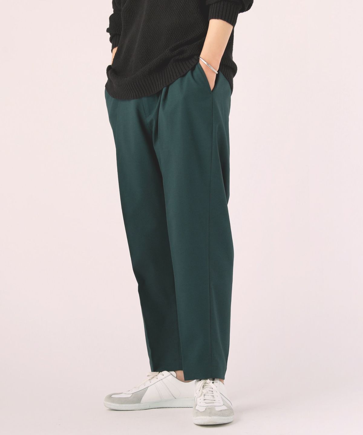 裾に向かって細くなるテーパードラインに、センタープレスを施した一本。ヒップから太股部分にゆとりがあり、程よい抜け感のあるコーデにまとまります。また、腰部分にゴムウエストを採用し、正面からの上品さはキープしつつ締め付け感がないリラックスアイテムに仕上がりました。