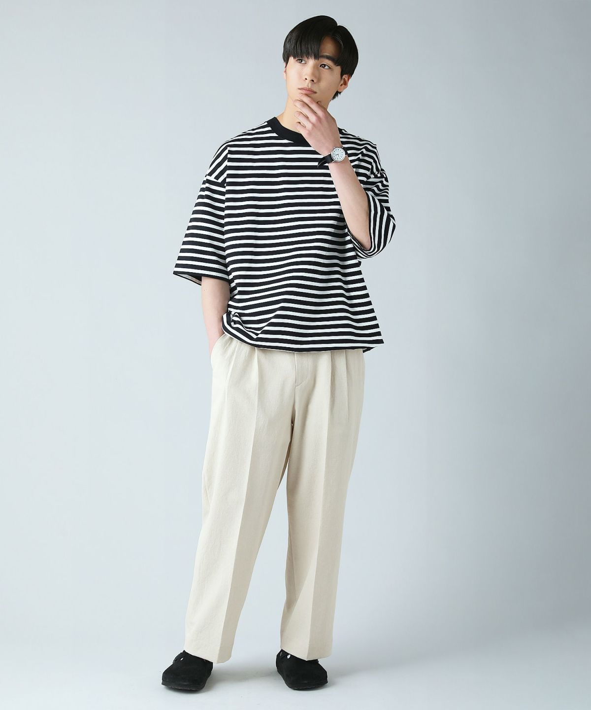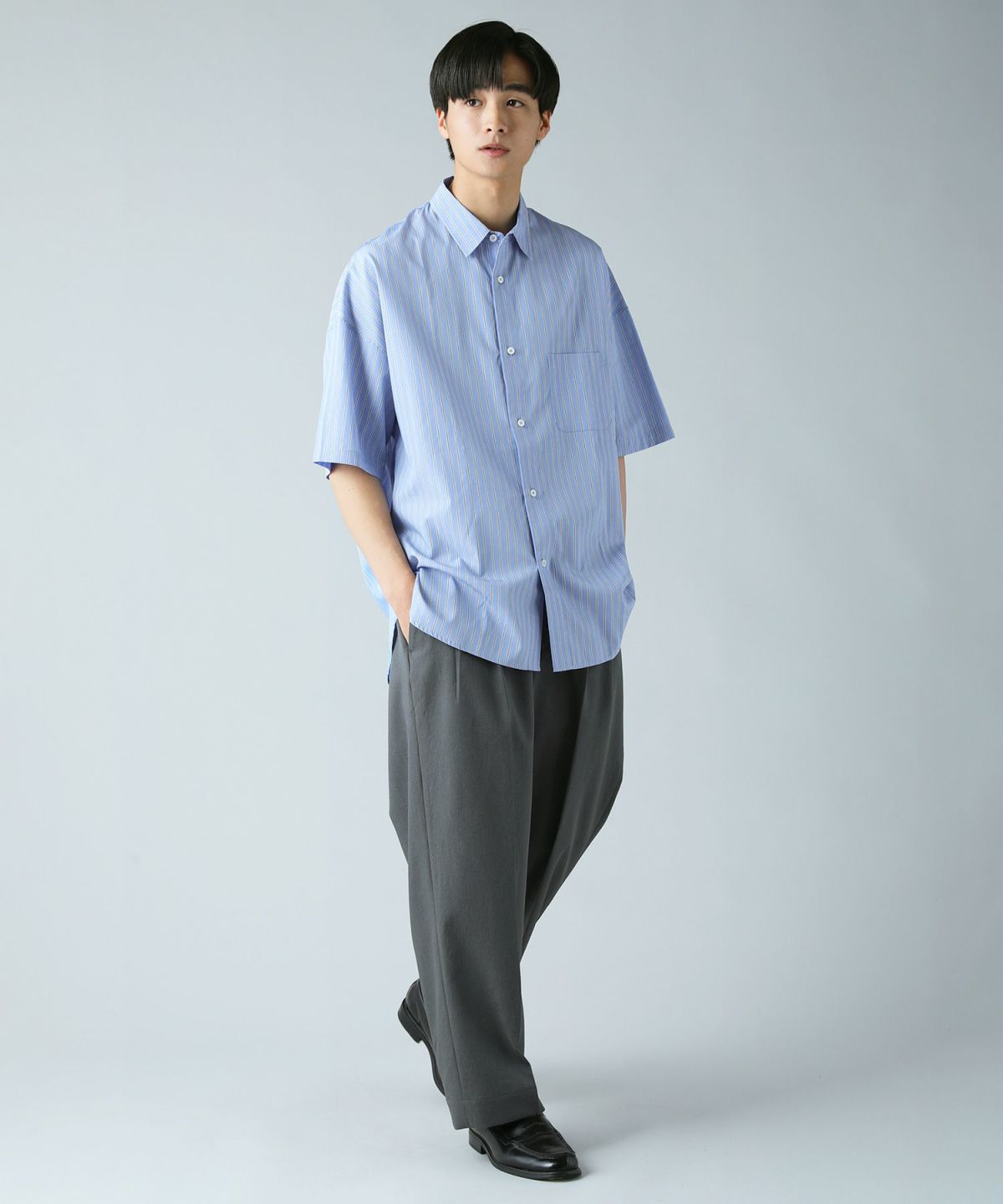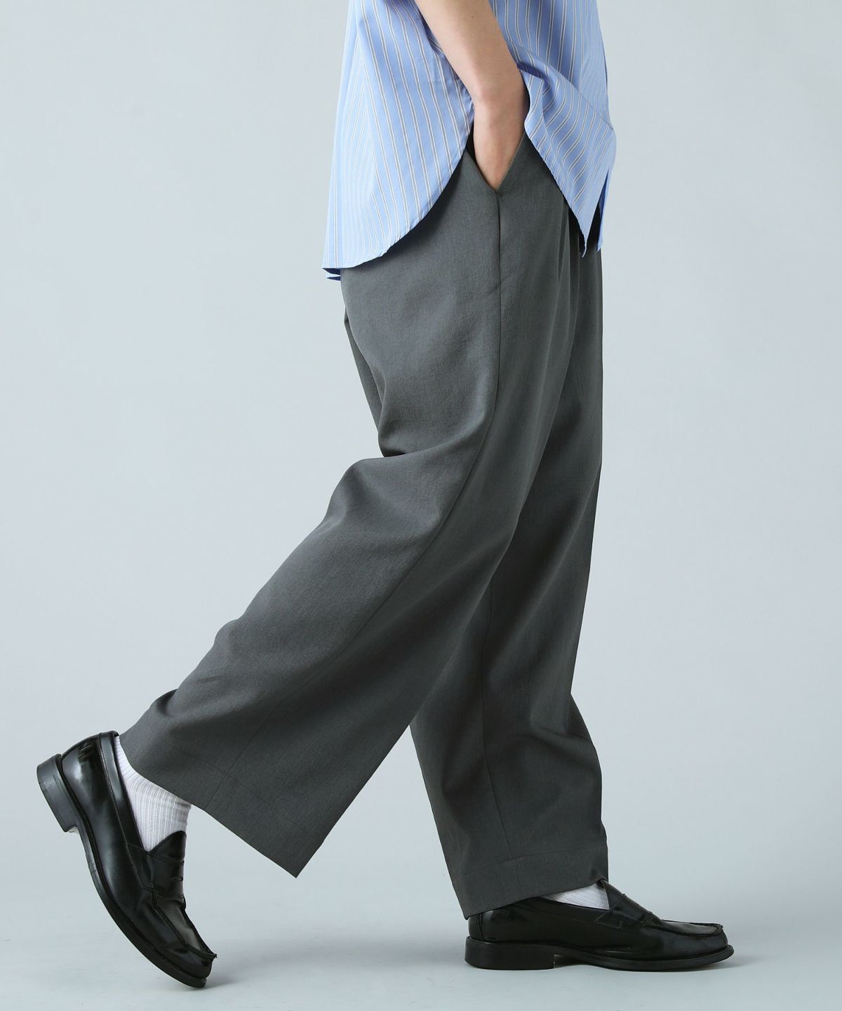 ドライタッチなカルゼ生地を使用したスラックス。程よくテーパードしたワイドシルエットで、フロントにタックとセンタープレスを入れることでクラシカルな印象に。カジュアルからキレイめまで幅広いスタイルに合わせてやすく、ワイドパンツながら着回しやすさにこだわった快適な一着です。