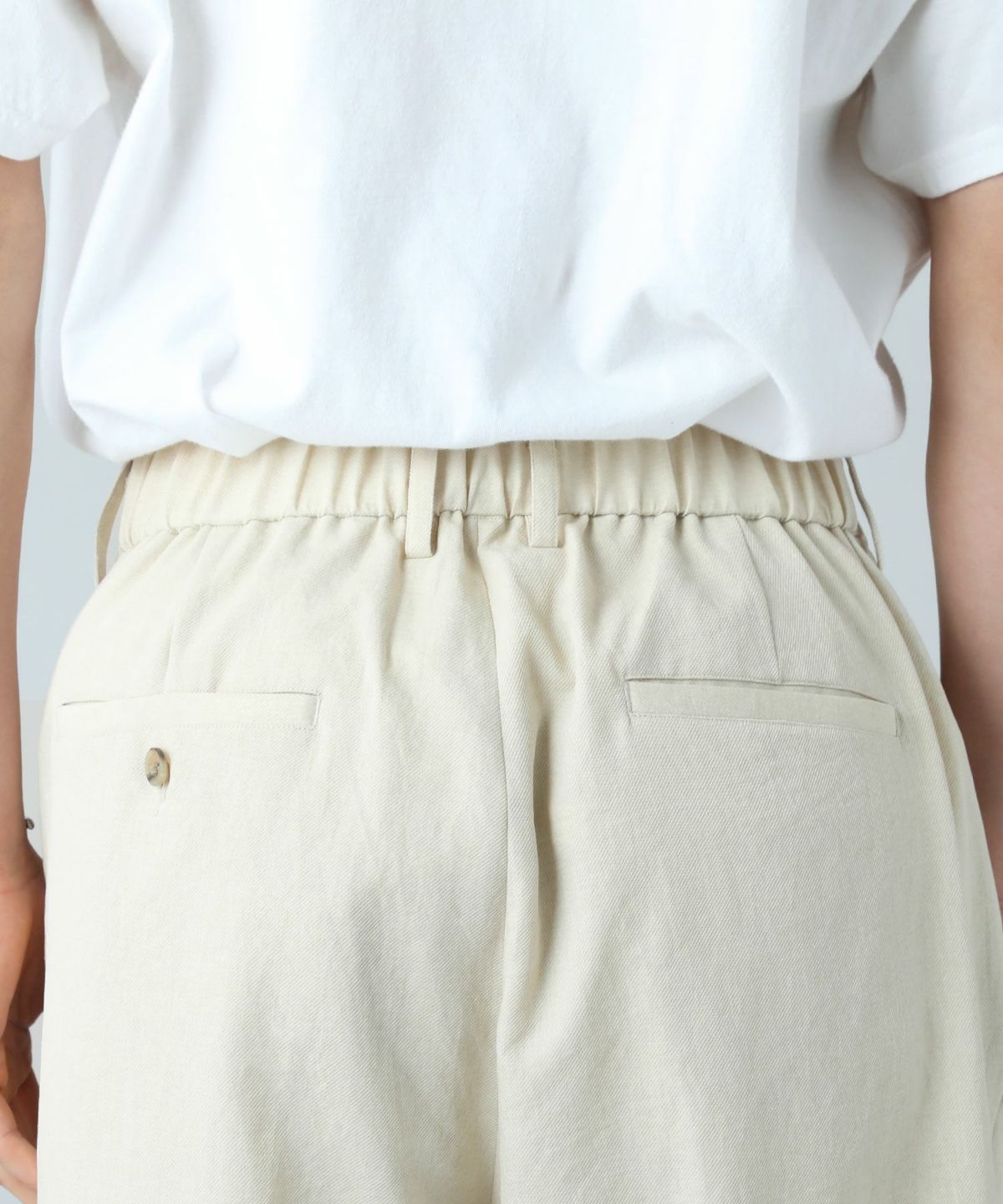 足のラインを拾わないすっきりとしたシルエットと、とろみのある上品なドレープが表情を作り、ルーズになりすぎない大人のスタイルを生み出します。ウエストは裏側にゴムが入ったイージー仕様で、幅広い体型をカバーしてくれます。