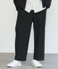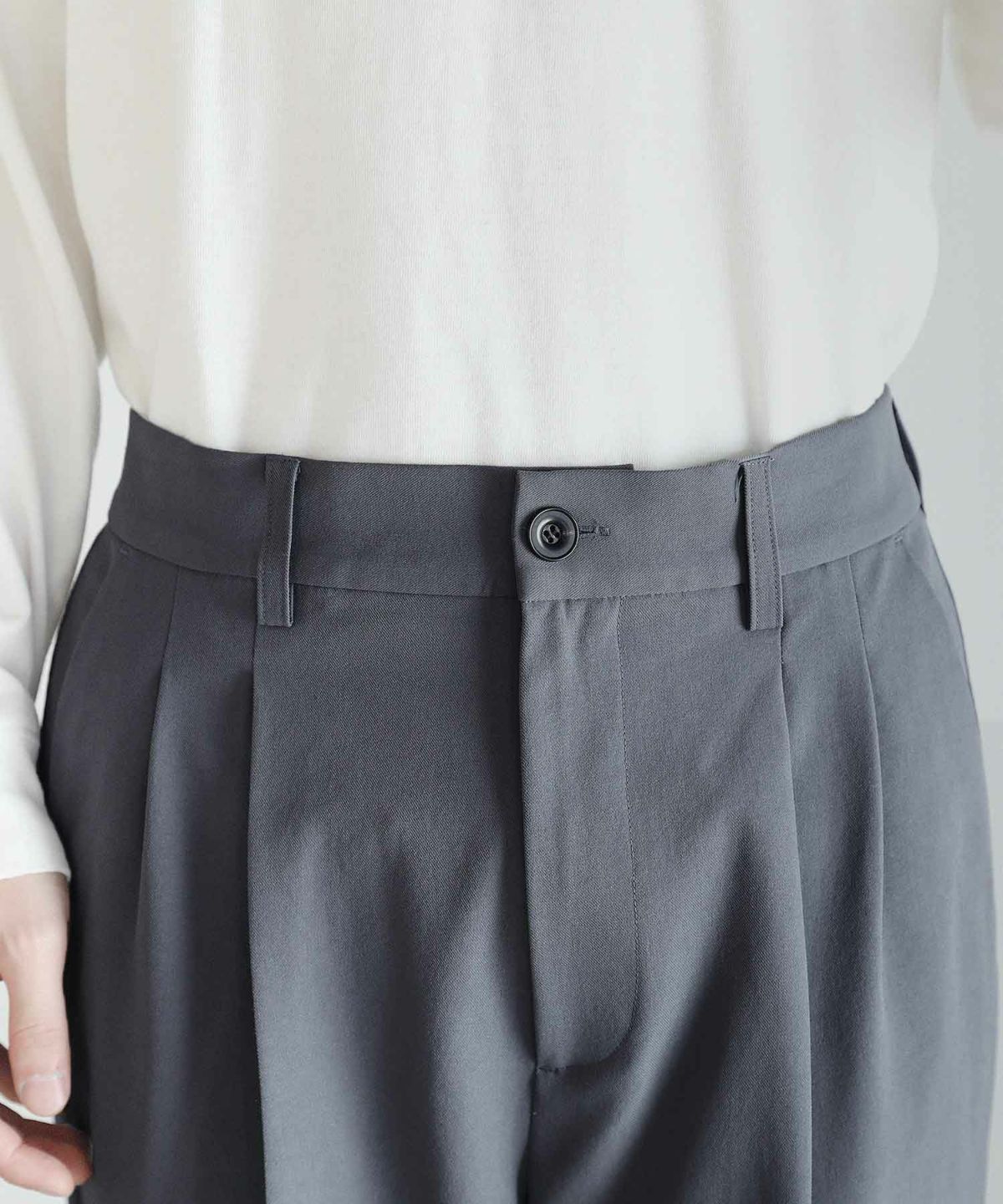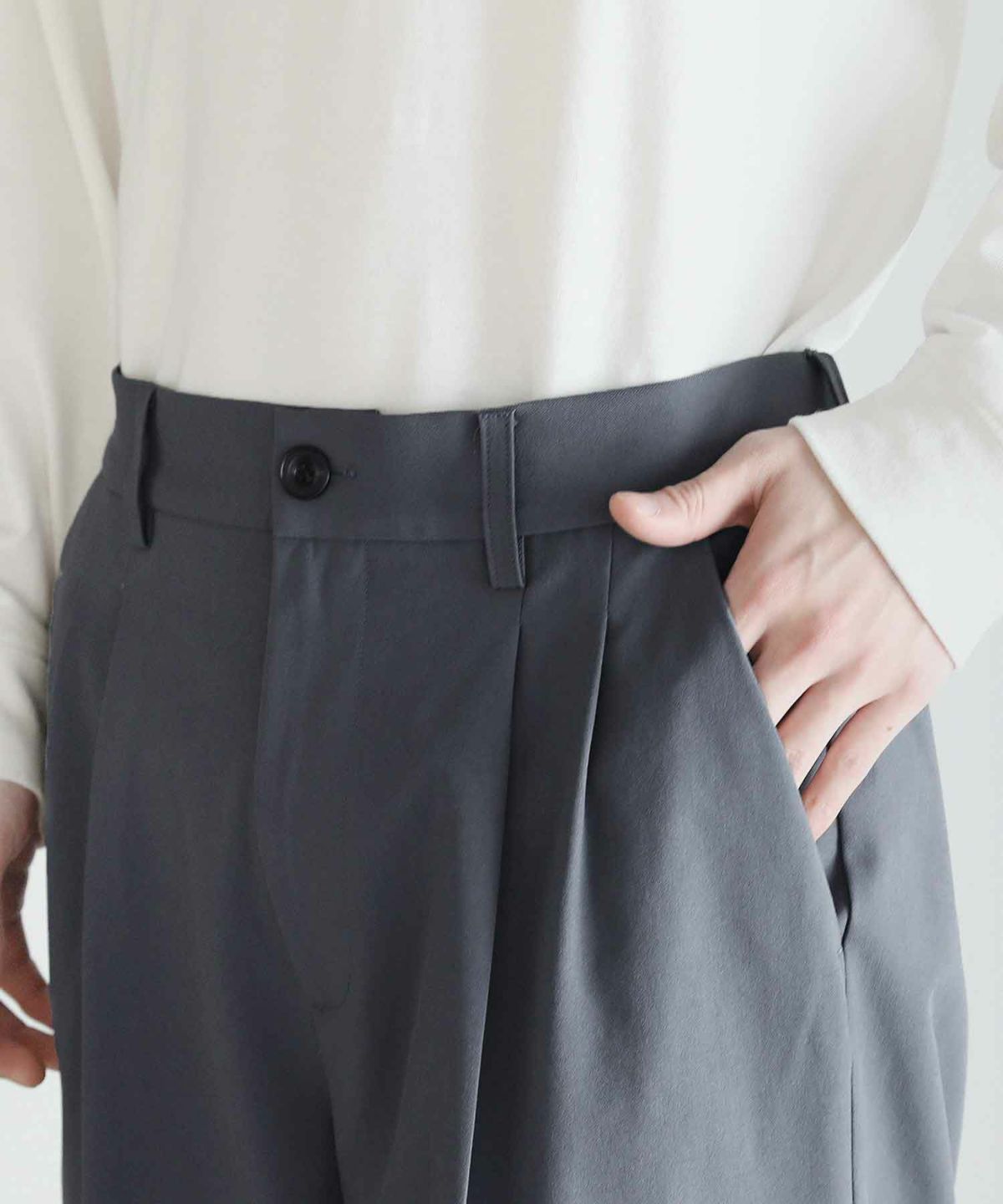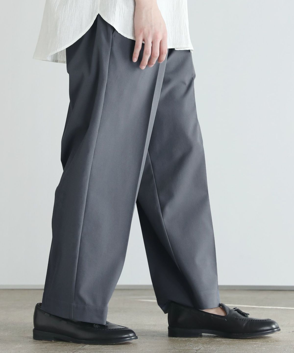 キレイめなルックスながらワイドなシルエットで程よくカジュアルダウンさせたデザイン。腰回りとわたりにゆとりを持たせているのでゆったりとしていてラクな穿き心地で、程よいストレッチ性があるので動作にストレスを感じさせません。抜群の穿き心地と手軽にケアできる素材でデイリーユースに最適なアイテムです。同素材のダブルテーラードジャケットやカーディガンを合わせたセットアップコーデもおすすめです。