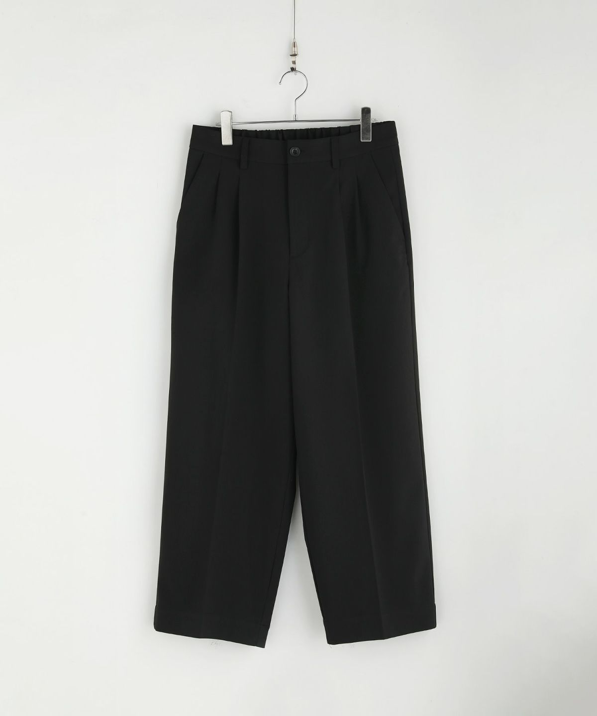 ツータック、センタープレス入りでキレイめコーデに合わせやすいアイテムです。ウエストは後ろゴム仕様で、幅広い体型の方にもマッチし、ラクな着心地を実現。すっきりとした丈感でワイドパンツながら、キレイめにも合わせられるミニマルで快適な一着です。