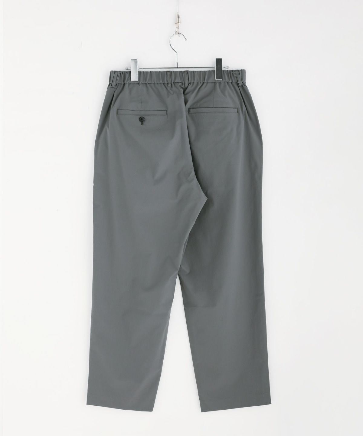 2タック入りなので腰回りにゆとりが生まれて窮屈感のないラクな穿き心地に。その上テーパードシルエットを採用しているのでゆったりとしつつも脚のラインは美しく見せてくれます。脱ぎ穿き楽々なイージー仕様でありながらもウエストのゴムは後ろ側のみに入れているためフロントはスッキリ見え。ベルトループも付けているのでタックインスタイルもサマになります。SOLOTEX(R)の持つ「形態回復性」と「高いクッション性」という特長が作用し、座ったあとでも座りジワが目立たず、いつでもキレイで清潔感のある着こなしを作ります。