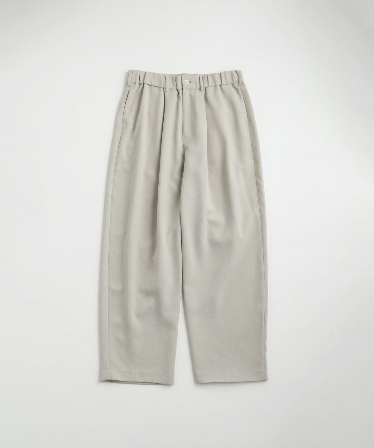 タック入りのワイドシルエットは様々なコーデに馴染みやすく、大人らしい上品な印象を与えてくれます。腰部分はゴムウエストを採用したラフなサイジングで、締め付け感がなく脱ぎ穿きもスムーズ。内側には紐も施されているため、細かい調整が可能に。ベルトループ付きなので旬のタックインスタイルもサマになります。さらに、あえてワンサイズ上を選んでベルトでぎゅっと締めたルーズなルックスも、今っぽさを添えてくれるおすすめの着こなしです。