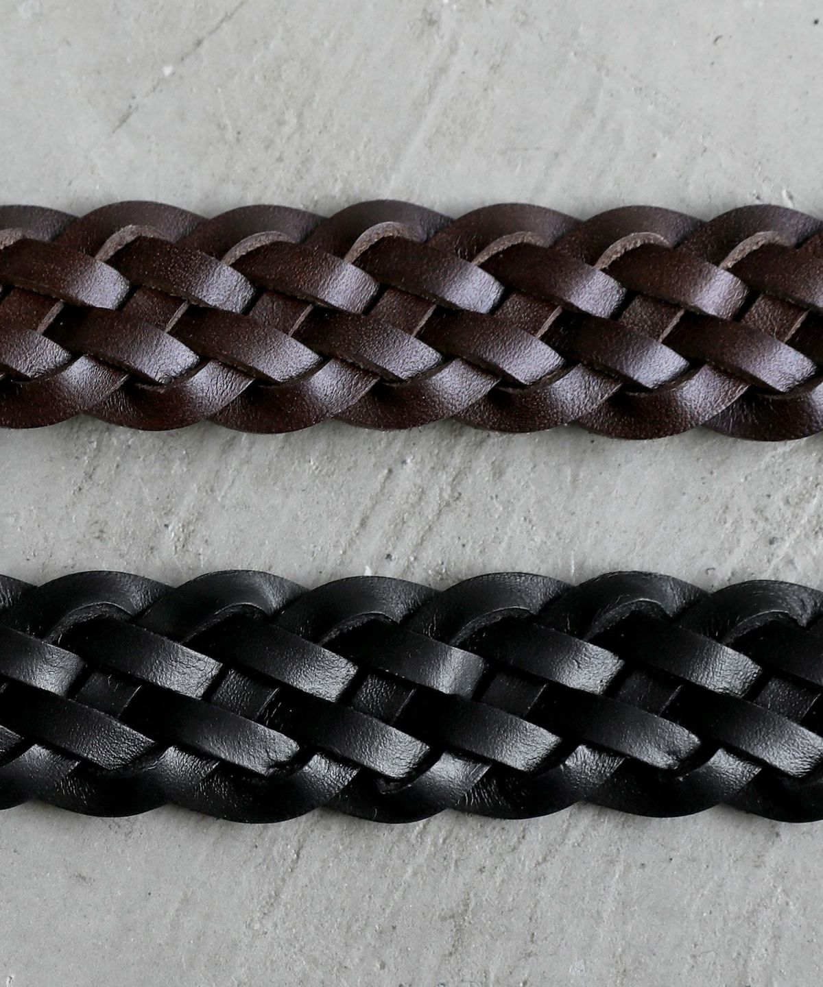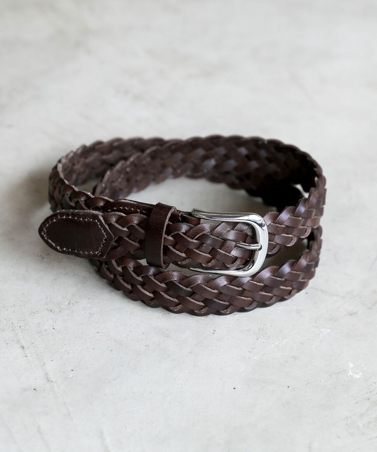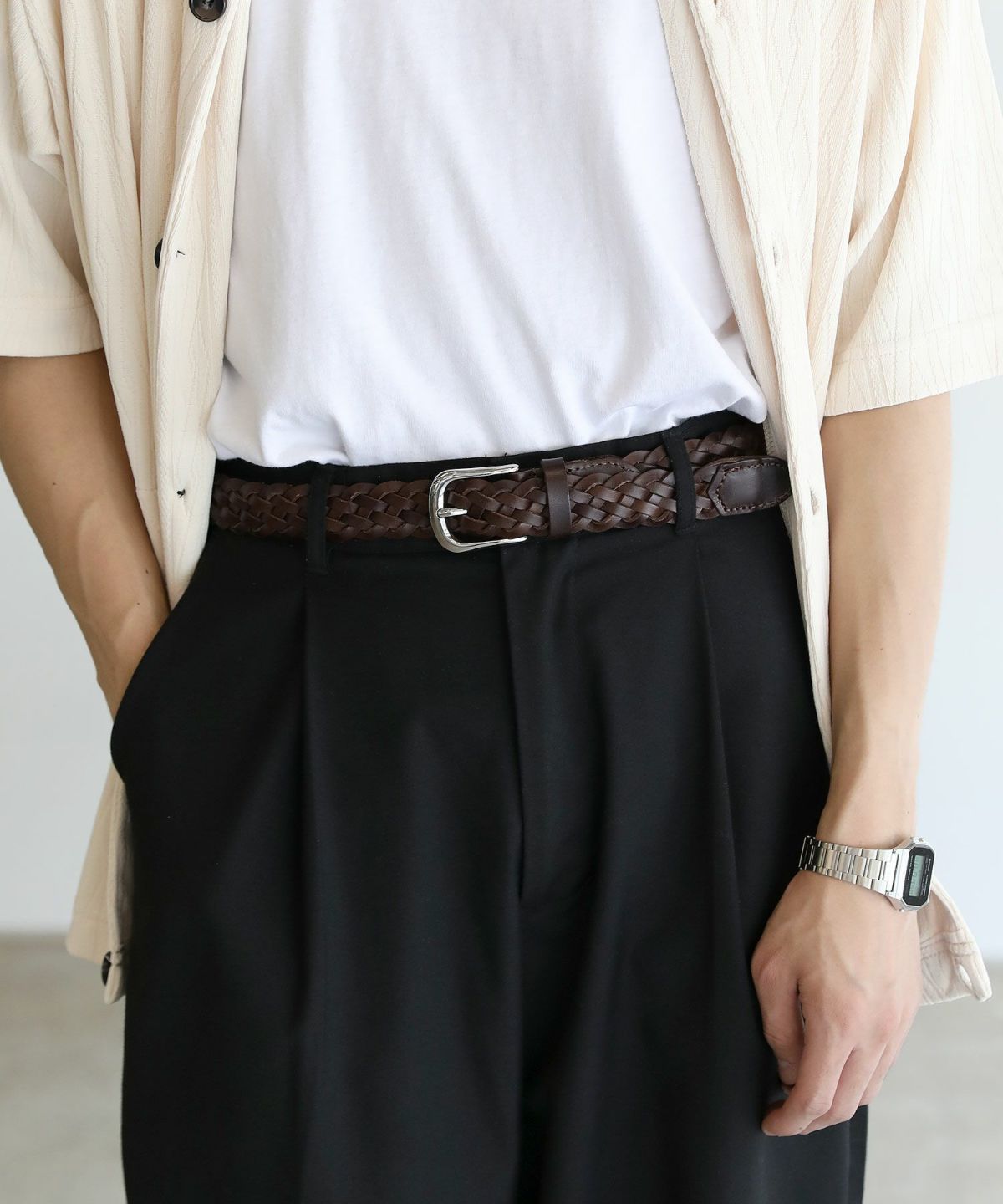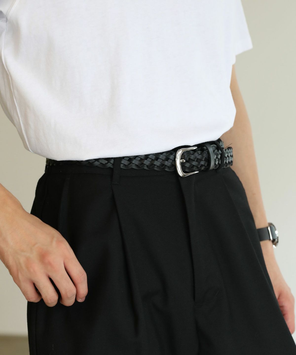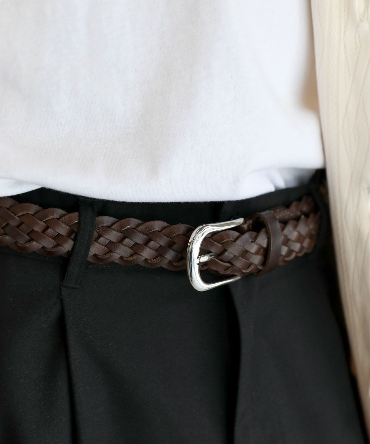 一般的なプレーンベルトとは異なり、メッシュの編み目の好きな位置でバックルのピンを通せるのがメリット。適度な厚みと丈夫さがありながら、とても軽くてしなやかな手ざわりが特長です。バックルはメタル加工を施したラウンドデザインで、細過ぎず太過ぎない上品な幅感は、タックインスタイルなど様々な着こなしで活躍します。