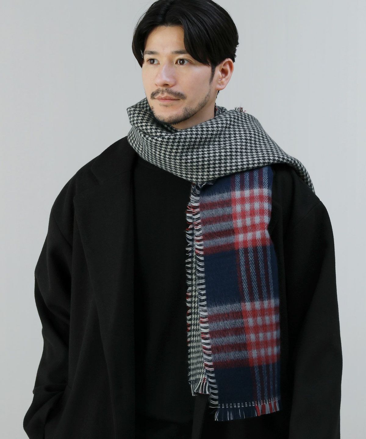 上品なタータンチェックと千鳥格子柄をリバーシブルで楽しめる1枚。トーンの異なるリバーシブルデザインは、気分に応じて使い分けることで着こなしの幅が広がるのが魅力です。大判サイズのため首元に巻くだけでボリュームが出て、存在感を発揮します。