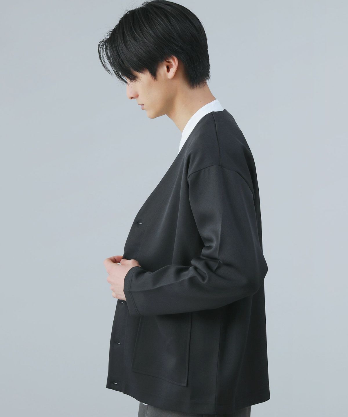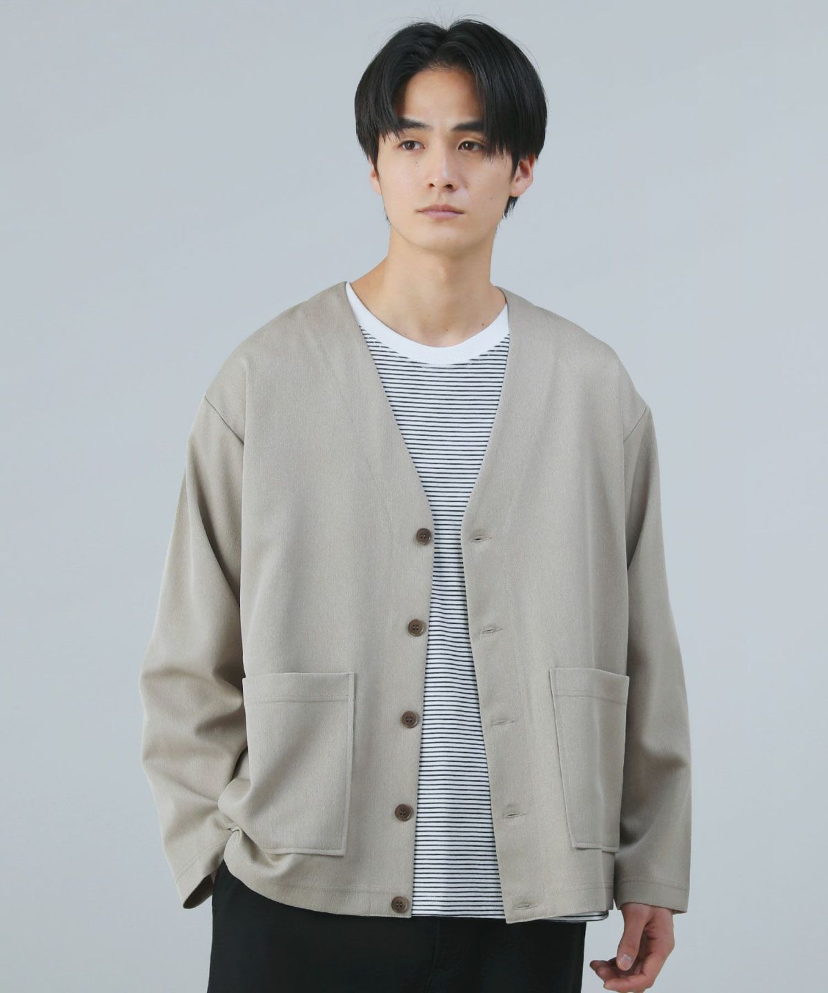 ノーカラーデザインなのでカーディガンのような感覚でラフに羽織れて、キレイめコーデにもカジュアルコーデにも合わせやすい一着。温かみを感じる生地感で、春先や秋口などの季節の変わり目のライトアウターとして重宝します。