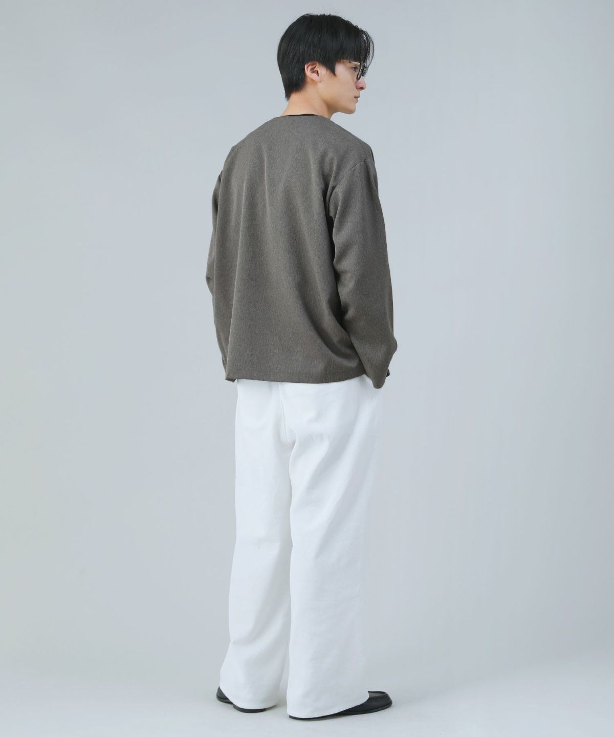サイズはややゆとりをもたせつつもルーズになりすぎないように設定しており、リラックス感がありながら品のある雰囲気に。薄手でありながらしっかりとしたハリ感があるのでシルエットがキレイに保たれます。