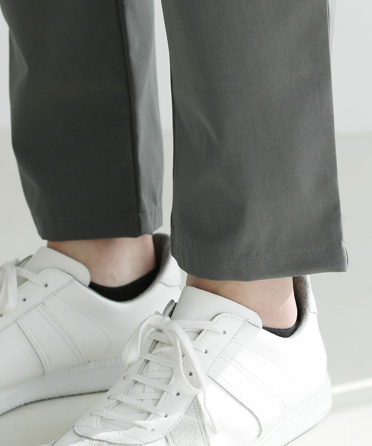 ボトムのテーパードパンツはウエストに平ゴムと紐を通したイージーパンツ仕様で、窮屈感のないラクな穿き心地のパンツに仕上げました。裾にクッションが生まれないようにジャストレングスで設計しているので、脚がすらっとキレイに見えます。