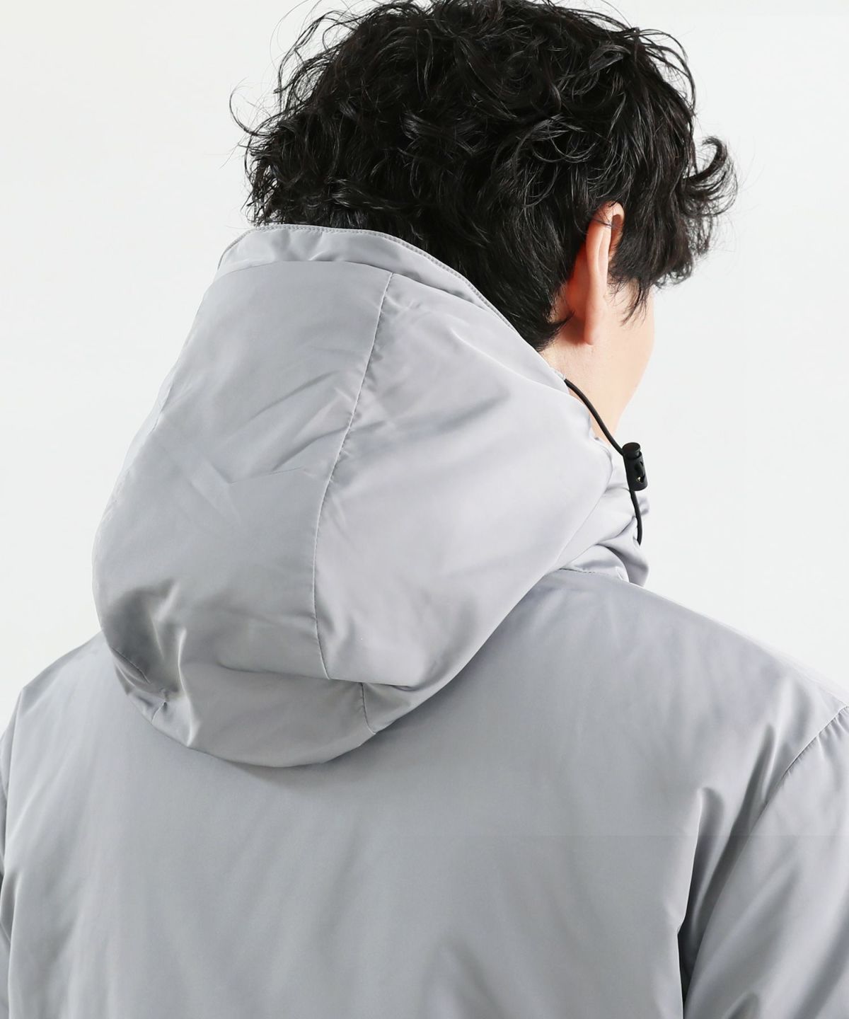 フードは締め加減を調節できるドローコード付き。風の強いときに重宝するあったかフードです。