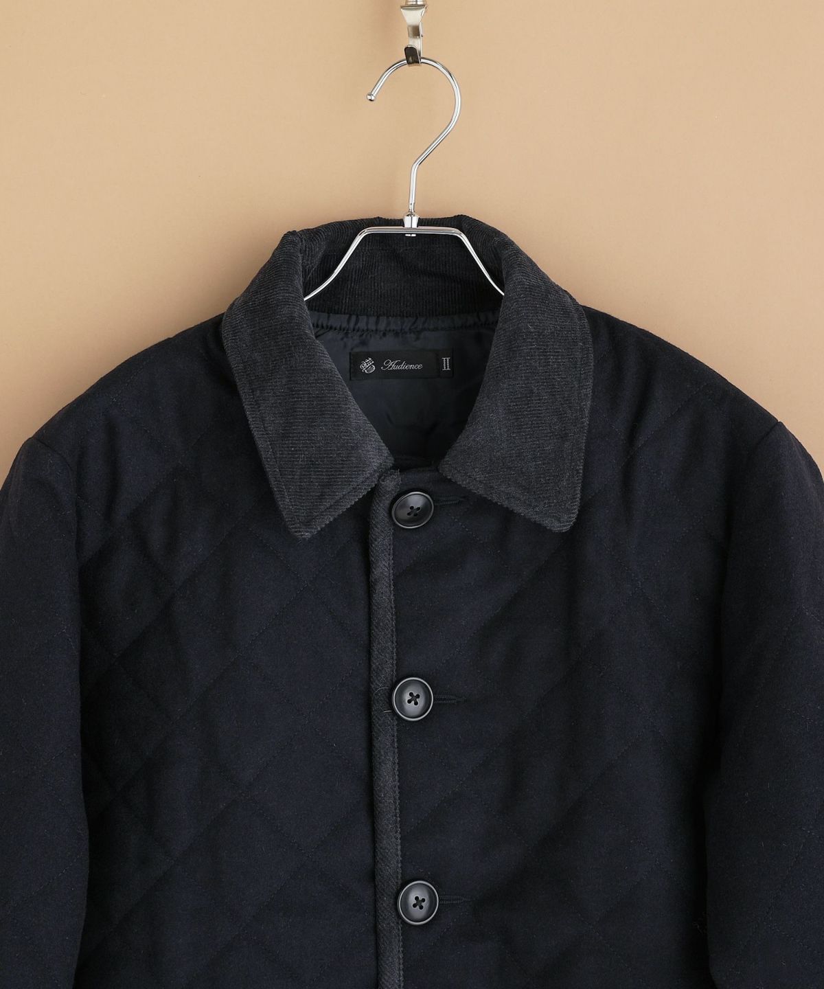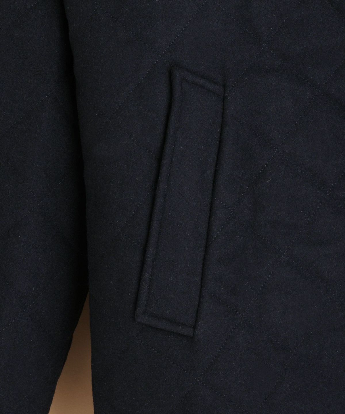 今回は148cm×100cm四方の重さが610gのメルトン素材を使用し、軽量かつ程よく厚みを持ったバランスの良い生地に仕上げました。更にキルティング加工を施し、保温性や耐久性もプラス。肌寒い季節でも確かな温もりを感じられる一着です。裏地にはサラッとしたポリエステル素材を100%使用。ニットなど厚手のトップスの上から羽織っても着脱がしやすく、ストレスフリーな着心地でお召しいただけます。