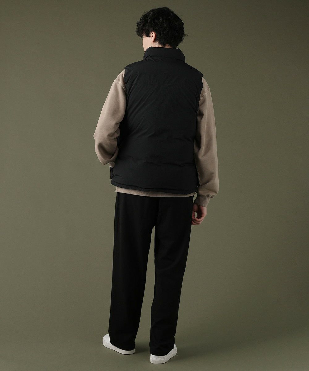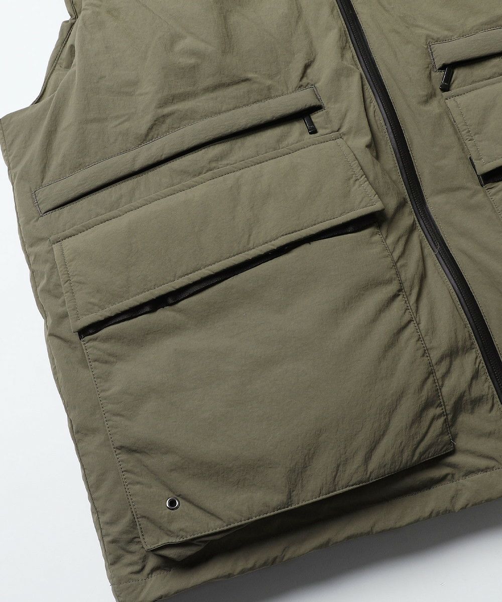 適度なハリのあるナイロン生地を使用したダウンベスト。