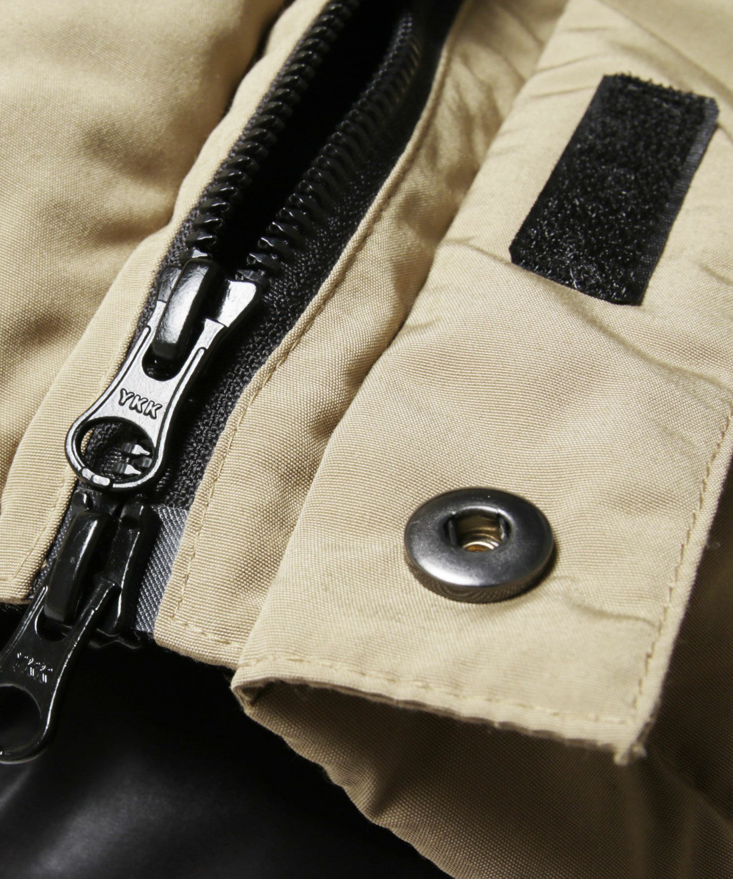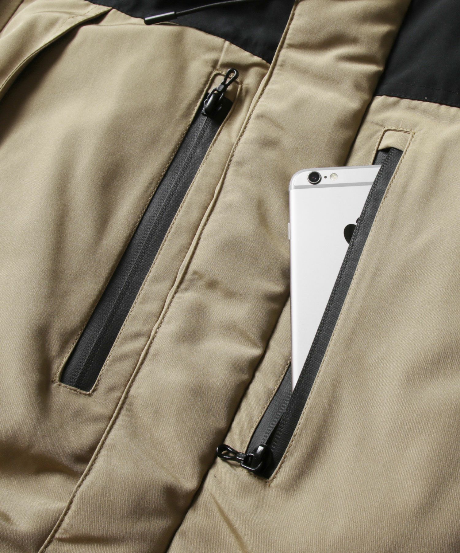 胸元には止水ジップを配置。スマホや財布、自宅のカギなど小さいものを収納するのに便利なサイズ感。フロントはジップとマジックテープ比翼による二重構造で冷たい風から身体を守ってくれ、保温性も高くなっております。