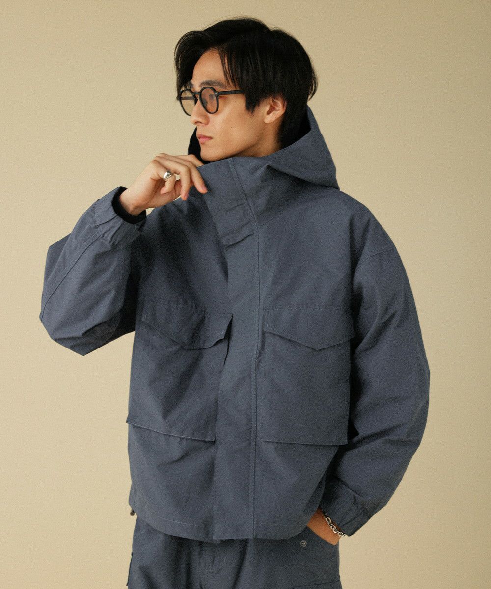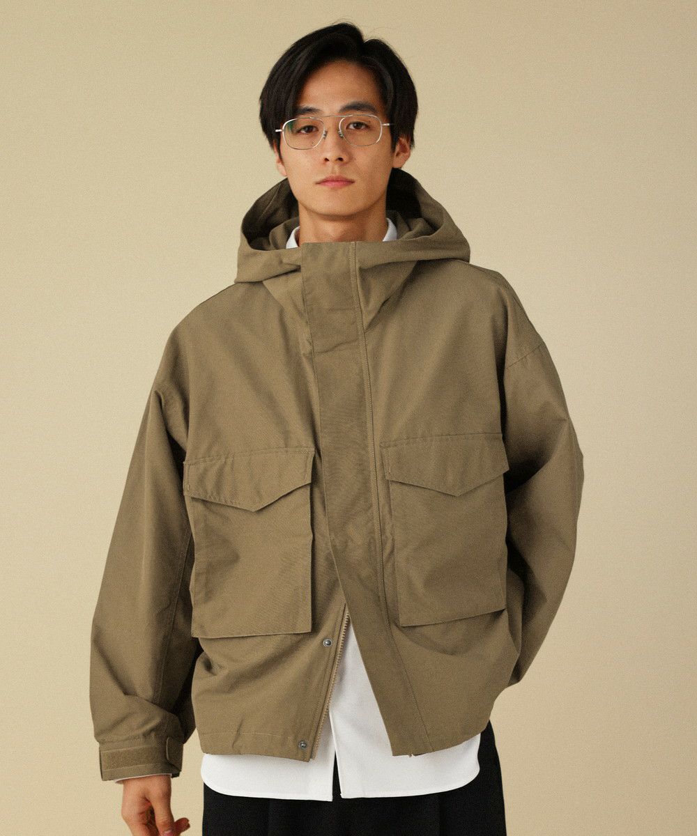 フード一体型のネックは首回りを覆って格好良く決まるハイネックデザインを採用。フロントのファスナーは上下どちらからも開閉可能なダブルジップなので、下だけ開けてインナーを見せるレイヤードスタイルなども可能に。着こなしの幅が広がるディテールです。風の入り込みを防ぐためにファスナーの上からさらにボタン留めできる仕様にし、裾を絞ることができるドローコードも仕込みました。