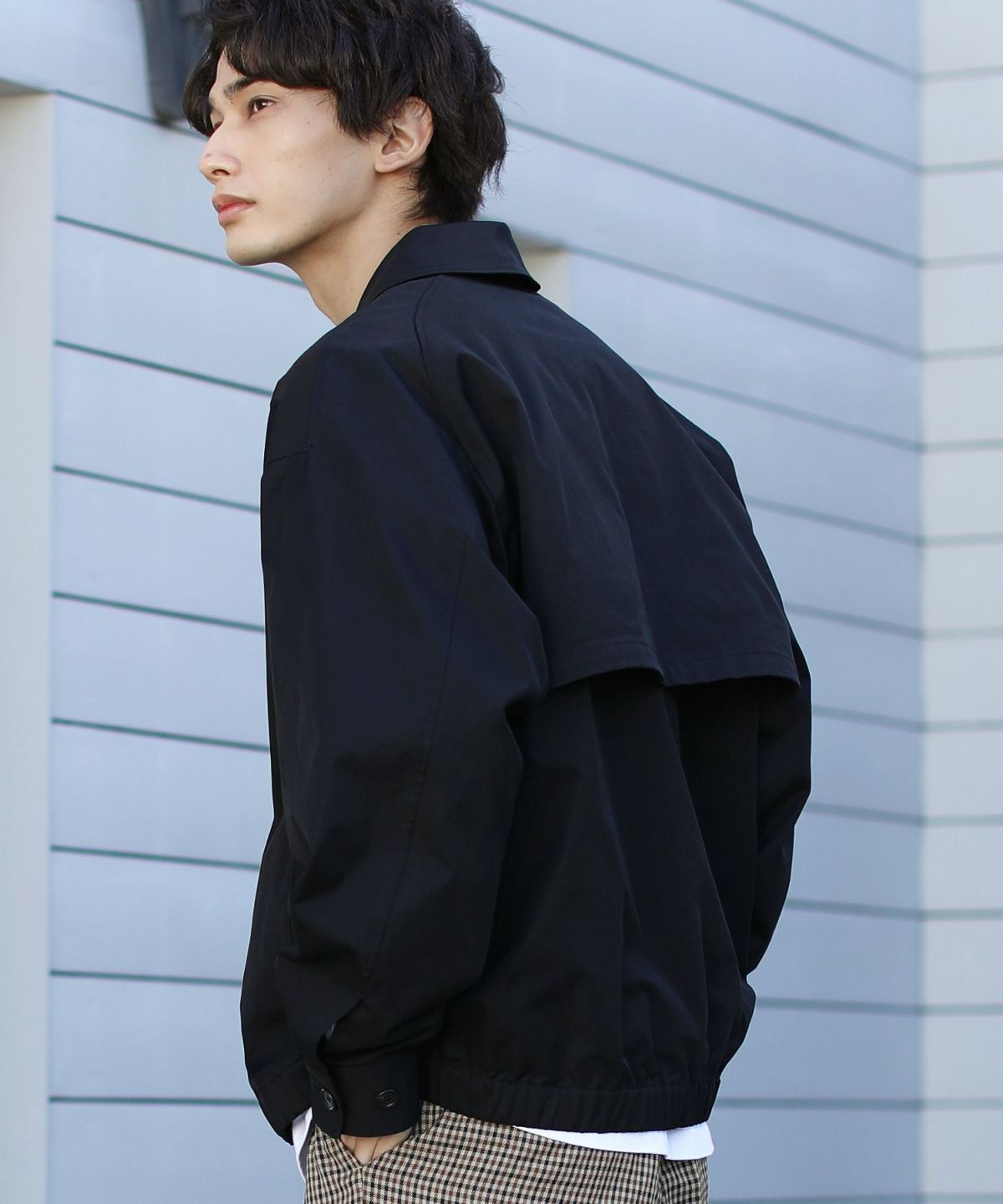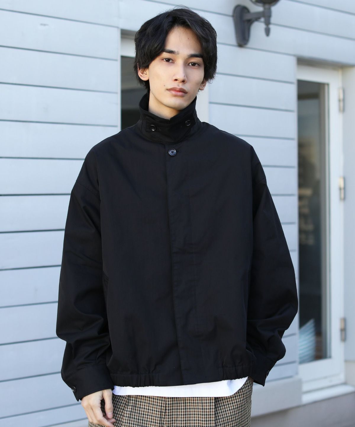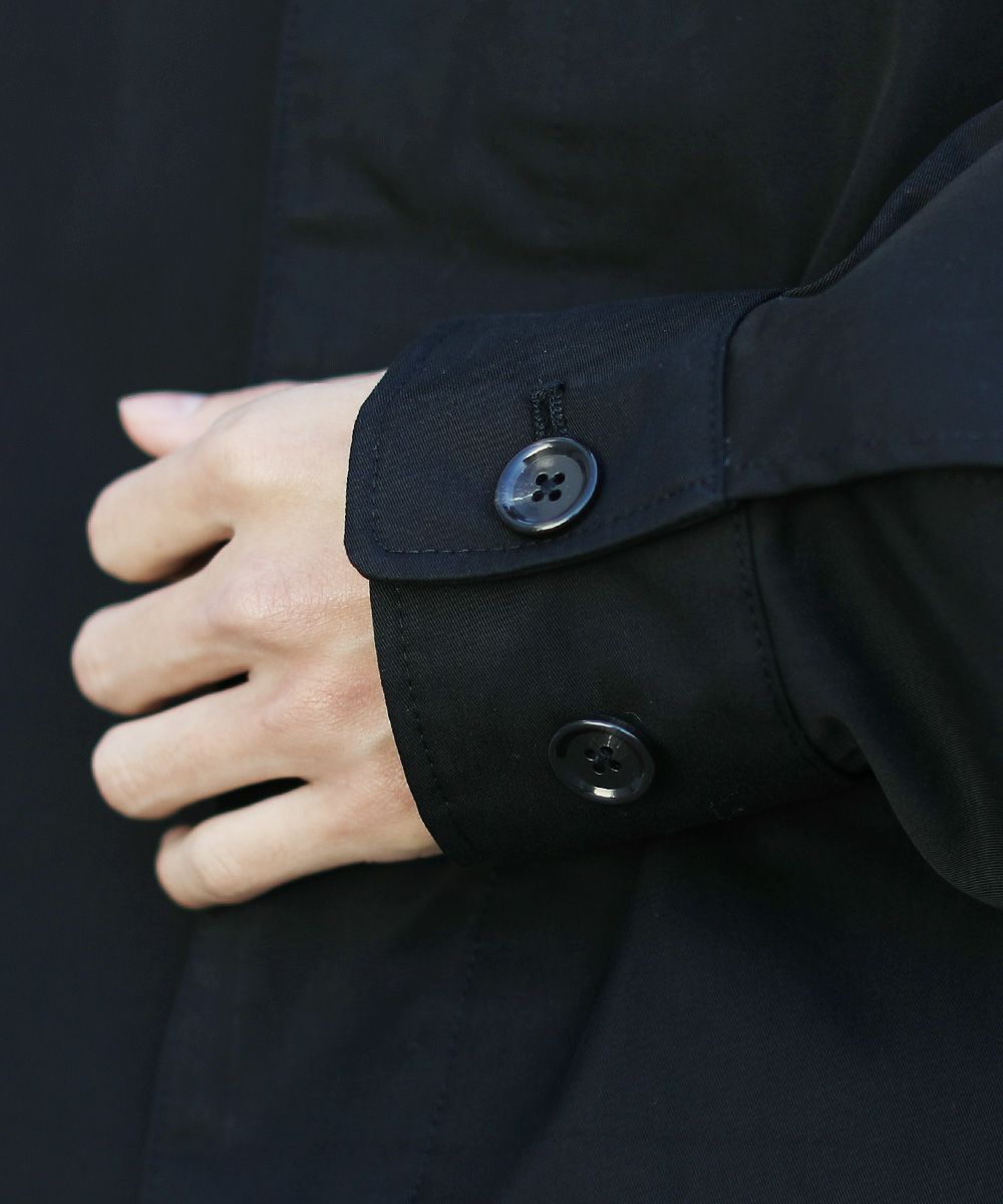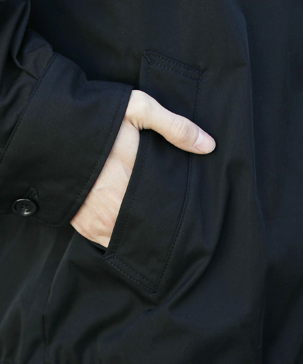 前立ては比翼仕立てのボタン仕様で、すっきりした印象のデザインに仕上げました。チンストラップで衿を立てたスタイリングも可能なので、お好みやコーデに合わせた着こなしを楽しめる一着です。ワイドな身幅やたっぷりとった袖幅と丈感など、全体のシルエットでトレンドを感じられるアイテムとなっております。