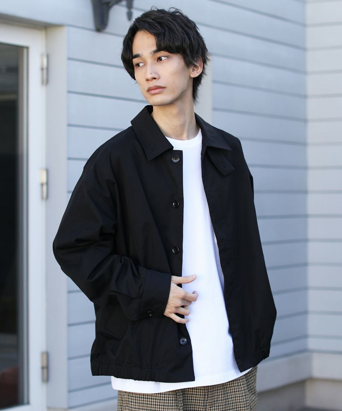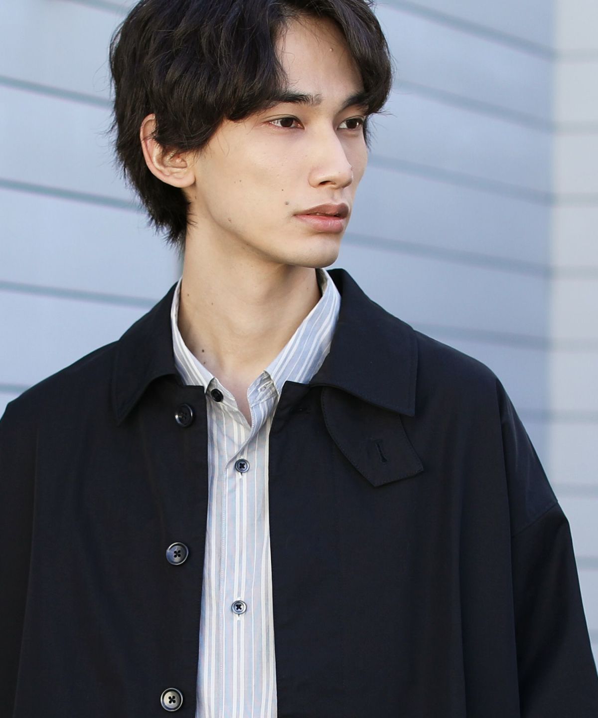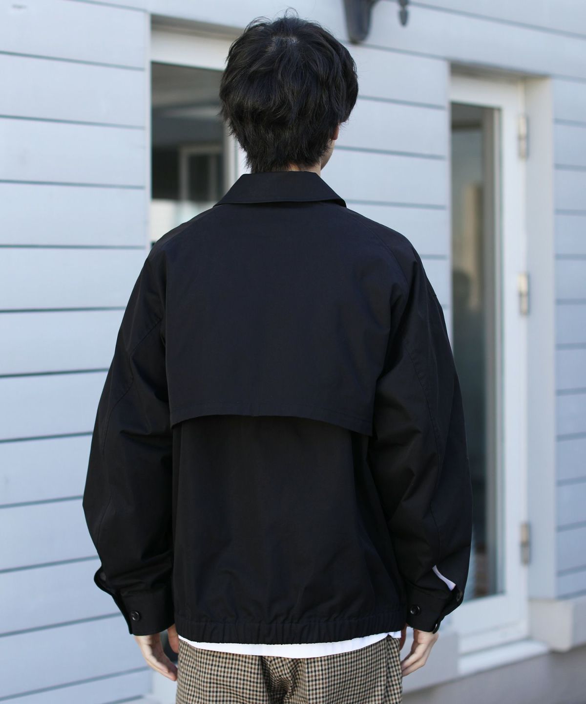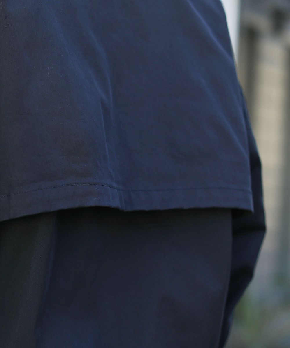 前立ては比翼仕立てのボタン仕様で、すっきりした印象のデザインに仕上げました。チンストラップで衿を立てたスタイリングも可能なので、お好みやコーデに合わせた着こなしを楽しめる一着です。ワイドな身幅やたっぷりとった袖幅と丈感など、全体のシルエットでトレンドを感じられるアイテムとなっております。
