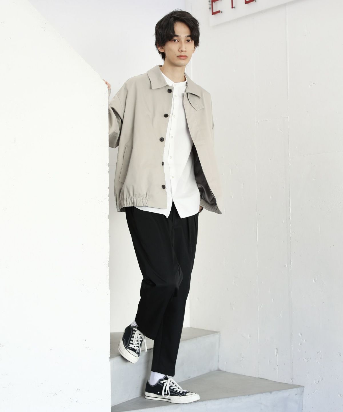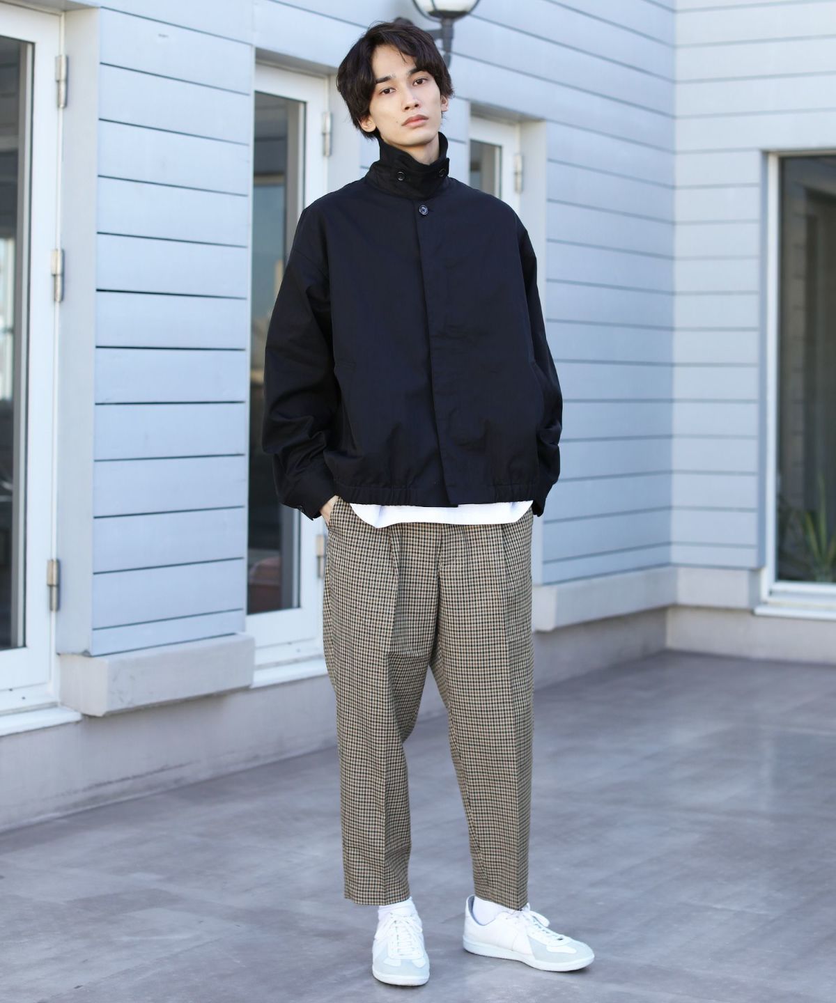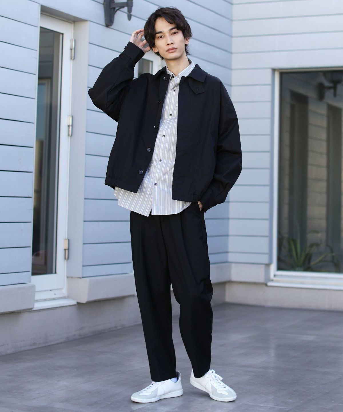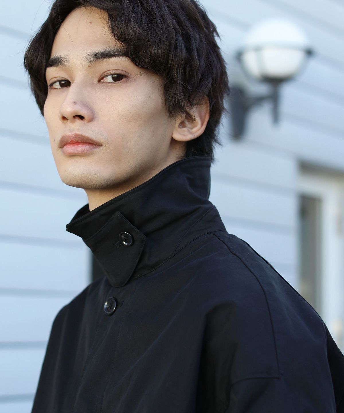 前立ては比翼仕立てのボタン仕様で、すっきりした印象のデザインに仕上げました。チンストラップで衿を立てたスタイリングも可能なので、お好みやコーデに合わせた着こなしを楽しめる一着です。ワイドな身幅やたっぷりとった袖幅と丈感など、全体のシルエットでトレンドを感じられるアイテムとなっております。