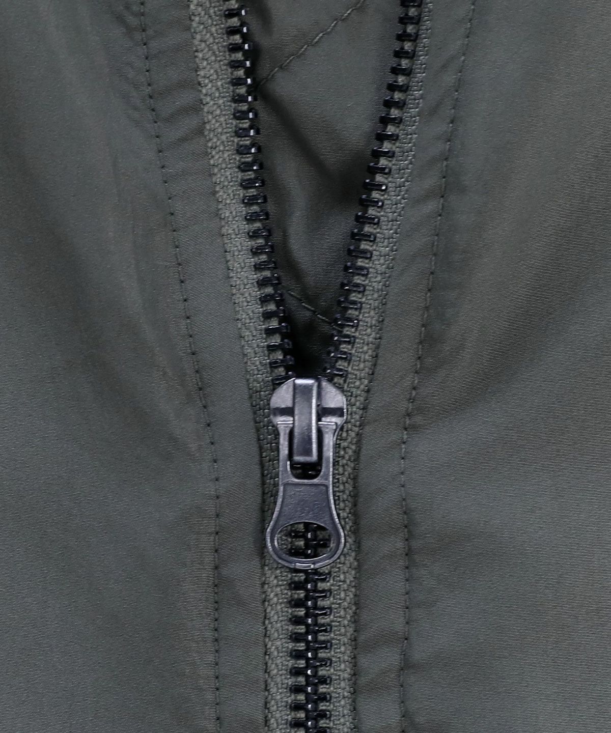 肩の落ちたドロップショルダー、袖とサイドに施されたシャーリングがアクセントになった1着。袖のシガレットポケットなどミリタリーらしいディティールを残しつつも、微光沢のある素材でキレイめな印象で着こなせます。中綿は入っておらず、すっきりと軽い着心地で季節の変わり目に活躍すること間違いなし。ちょっとしたお出かけ時などにも羽織りやすく、一着あると重宝するライトアウターです。