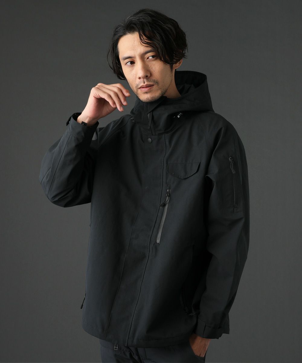 3レイヤーの特殊ウレタン透湿性フィルム「テクノブレン」を使用したシェルパーカージャケット。無数の微孔性があり、耐水圧20000m/m透湿性10000g/平方メートルの透湿防水機能が特長。湿気を逃がすことで得られるドライで快適な着心地だけでなく、防水性、難燃性(燃えにくさ)も兼ね備えたアイテムです。
