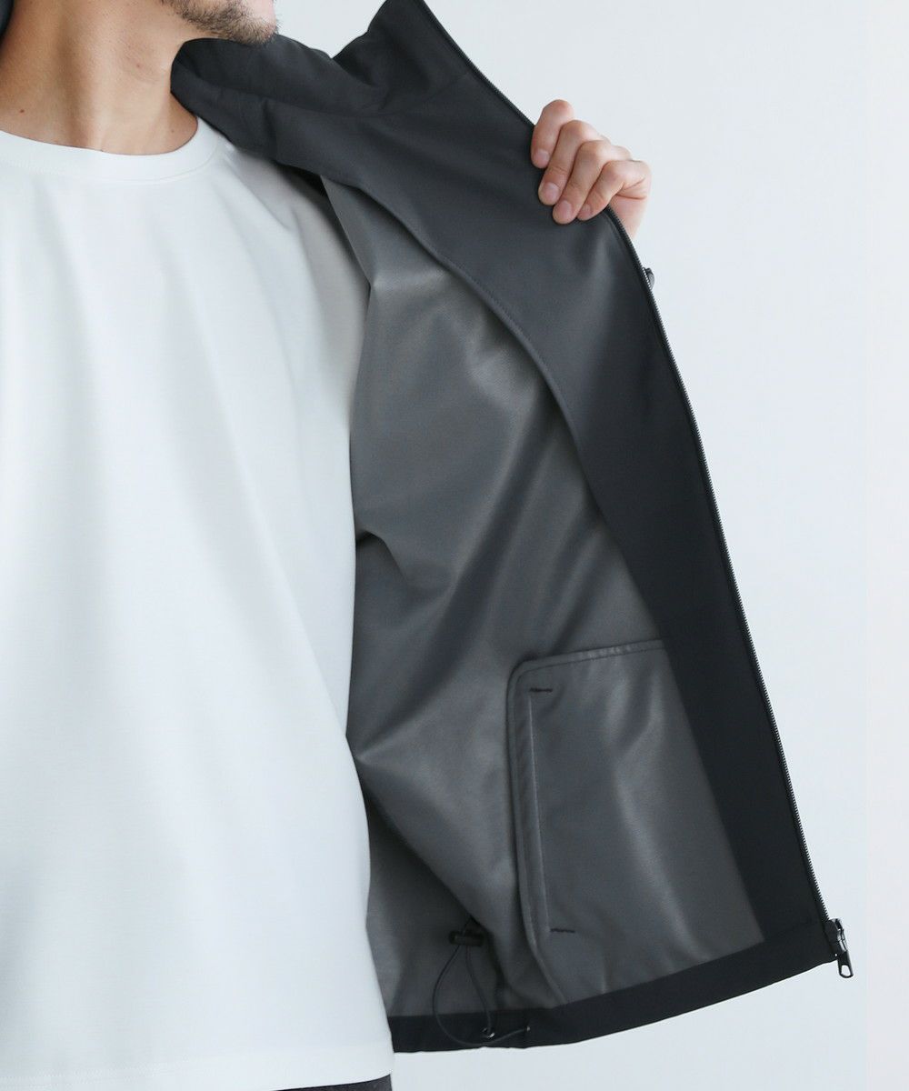 収納可能なフード付きの2wayネックデザインを採用いたしました。普段はネックに収納した状態ですっきりとしたスタンドネックジャケットに、雨天時にはフードを出すことでマウンテンパーカーのような実用性を発揮します。また、フロントに止水ジップ・袖口にゴム・裾にドローコードを配しているため、雨だけでなく冷気や風の侵入も防ぎます。細部にまで機能性を落とし込んだ、頼れるディテールが詰まった一着です。