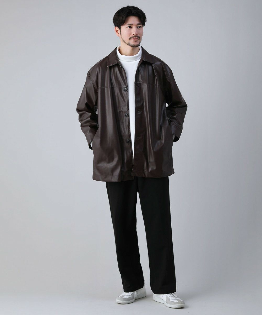 やや厚地のしっかりとしたフェイクレザーを使用したカーコートジャケットです。