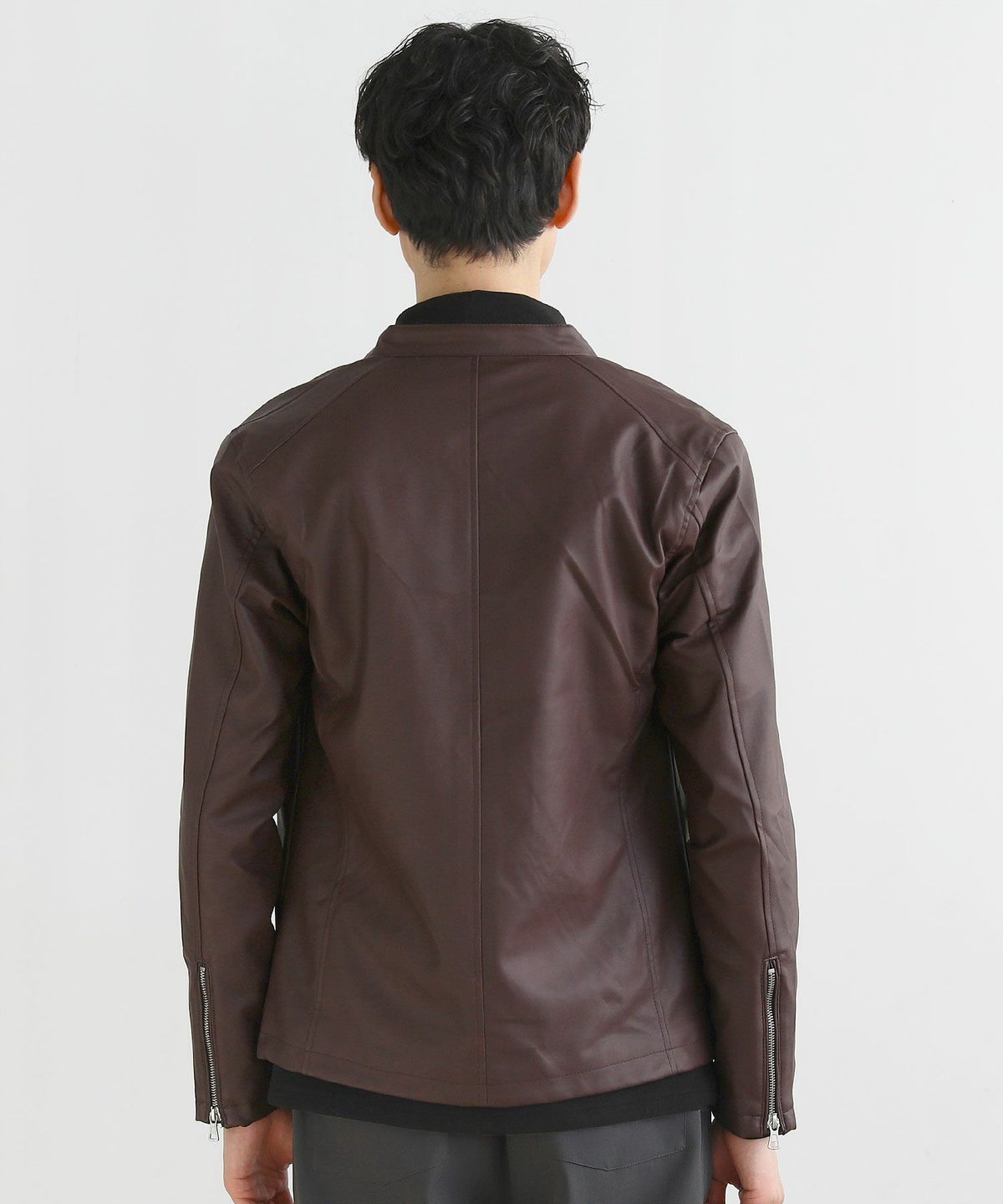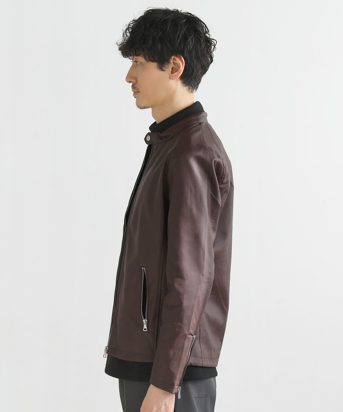 PUレザーを使ったジャケットにありがちなポケットやスタッズなどの装飾を最大限省き、コーディネートに取り入れやすいデザインに仕上げました。本革レザー同様の高級感とシンプルさを併せ持った、着回しやすさ抜群のアイテムです。