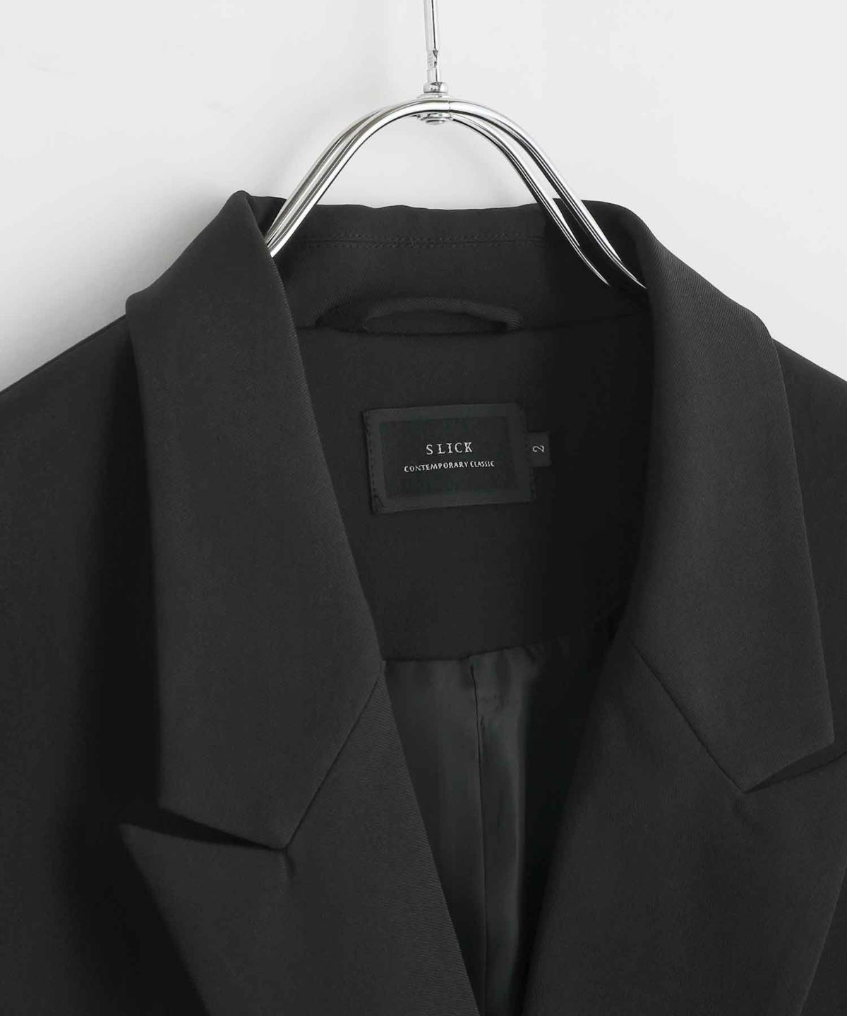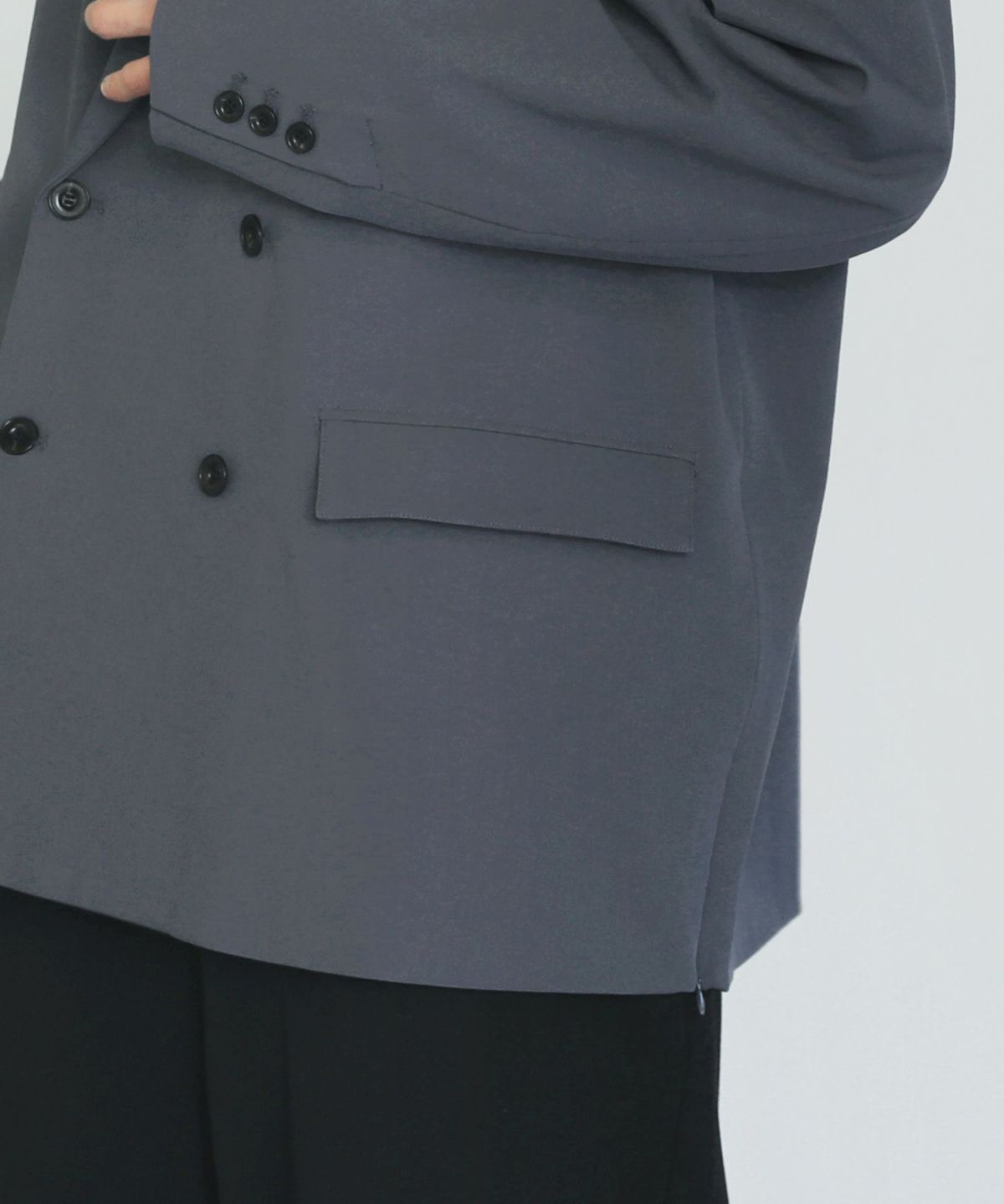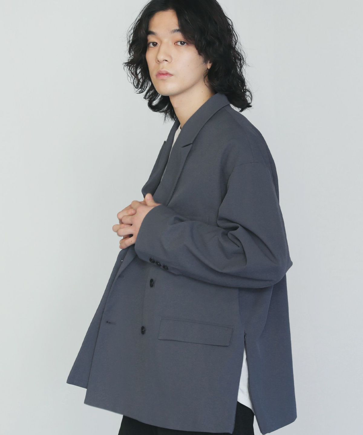 ストレッチ性を持つポリエステルツイル素材を使用した、さらっとしたタッチのダブルテーラードジャケット。素材の持つキレイめな表情と、オーバーサイズのカジュアルなルックスが程よいバランスのアイテムです。同素材のタックワイドスラックスとのセットアップスタイルもおすすめです。