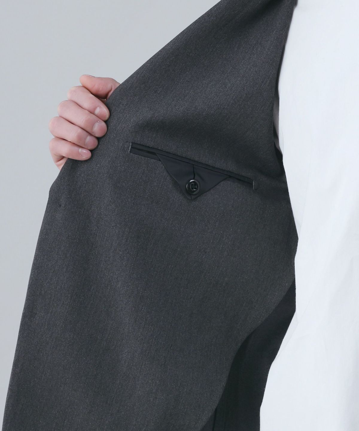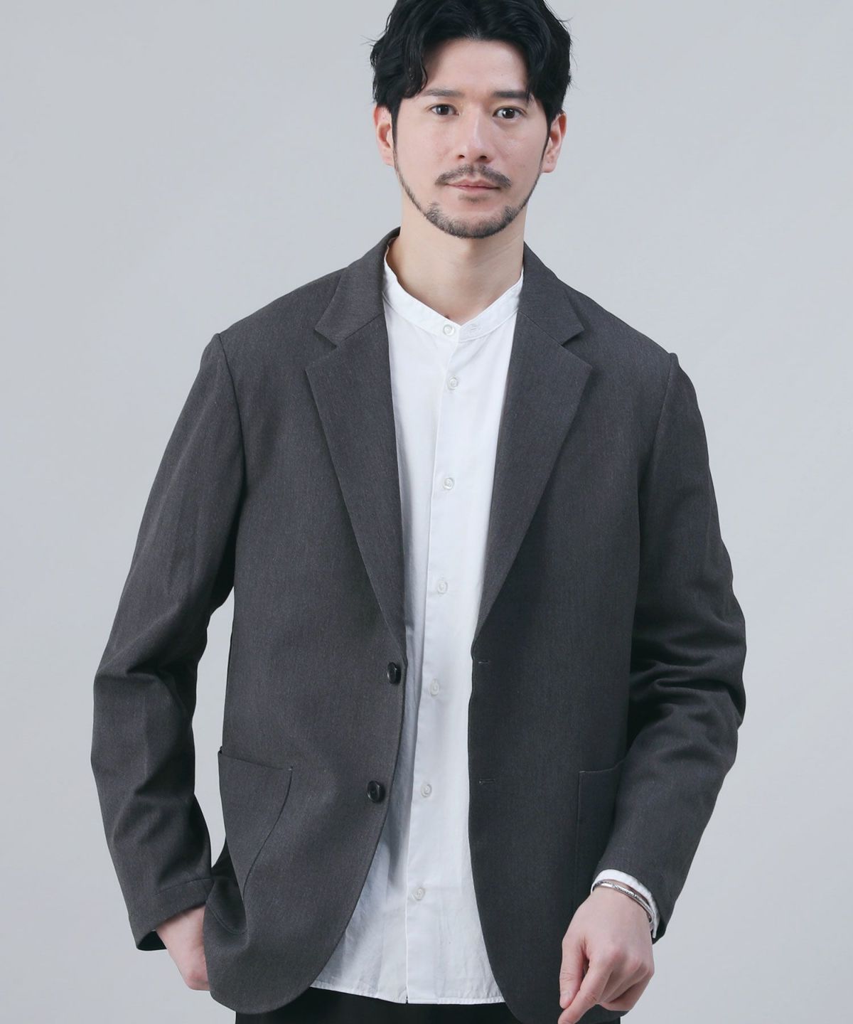 生地には肌の表面温度を常に快適な温度に保つ機能素材、アウトラスト糸を使用し、日本を代表する毛織物産地のひとつである尾州で織り上げました。縦横のストレッチ性、防シワ性もあり、機能的で着心地の良さが魅力的な一枚。スーツを縫製している工場で作られているため、非常にきれいなシルエットです。
