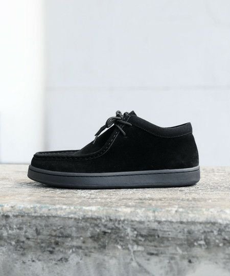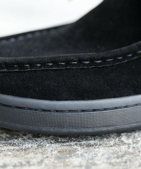甲部分がU字に縫製されたステッチが目を引く、モカシン縫い仕様のシューズ。