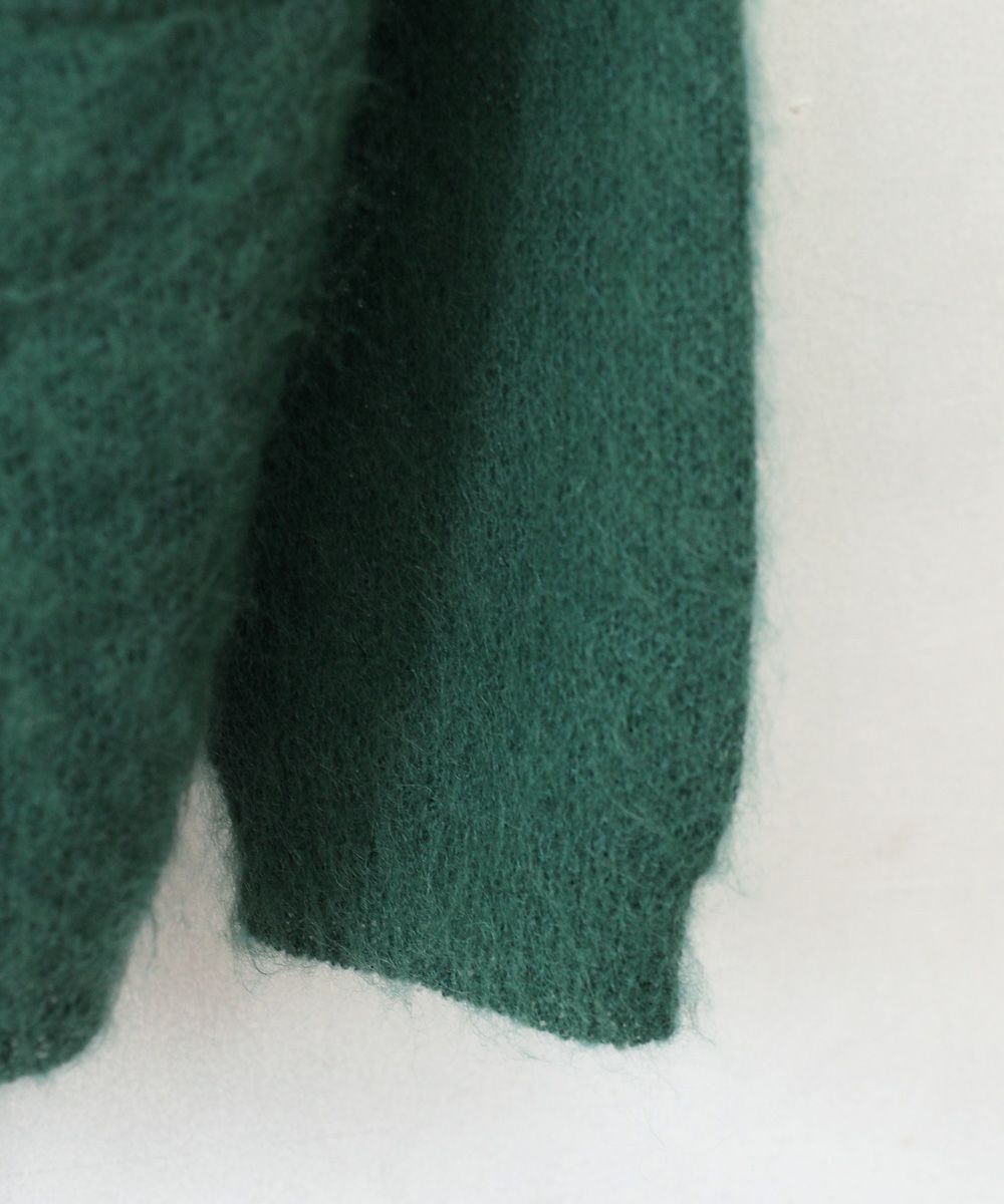 繊細な編み地が魅力のシャギーモヘアを使用。柔らかい手触りのモヘヤと繊維の中に空気を含みやすいウールをブレンドしており、軽さと温かさを兼ね備えています。