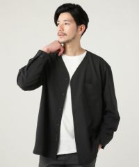 襟がないノーカラーと、胸元に配した大きなポケットが印象的なデザイン。前開きでインナーを見せてもコーデが決まりやすく、無地のクルーネックカットソーとの重ね着は相性抜群。落ち着いた大人の雰囲気を醸します。