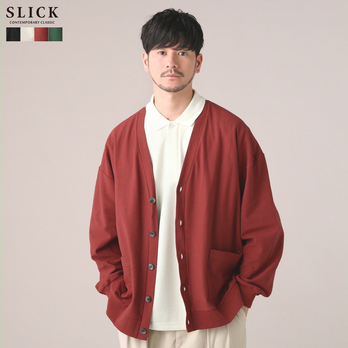ベーシックなブラック、グレーに加え、コーディネートのアクセントになるレッドとグリーンを合わせた4色展開。シンプルな着こなしから、ワンランク上のおしゃれコーデまで、スタイルの幅が広がります。