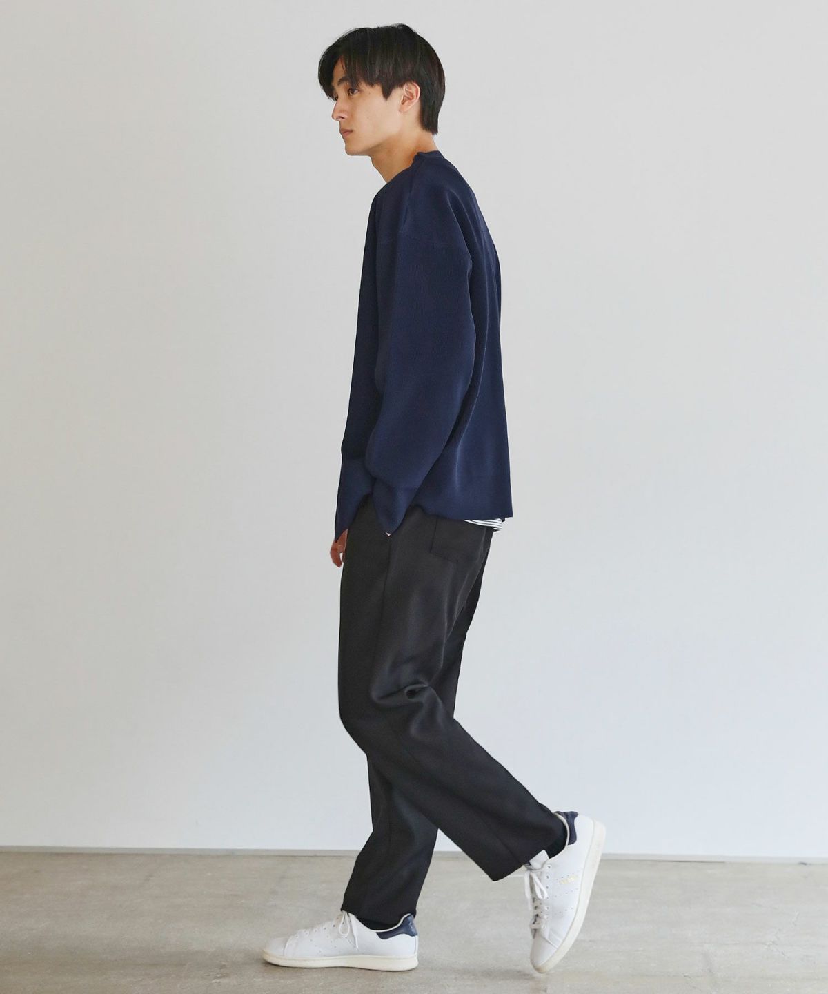 さらっとした滑らかな肌触りのニット地です。なるべく編み目を細かくすることで凹凸感を減らし、キレイめな表情に仕上げました。よりフラットな生地表面になることによって、ニットでありがちな引っ掛かりによる糸の飛び出しも軽減されます。日常的に気軽にご着用いただけるよう、糸はポリエステル100%のものを用いました。ご自宅でもお洗濯していただけるウォッシャブルニットになっております。