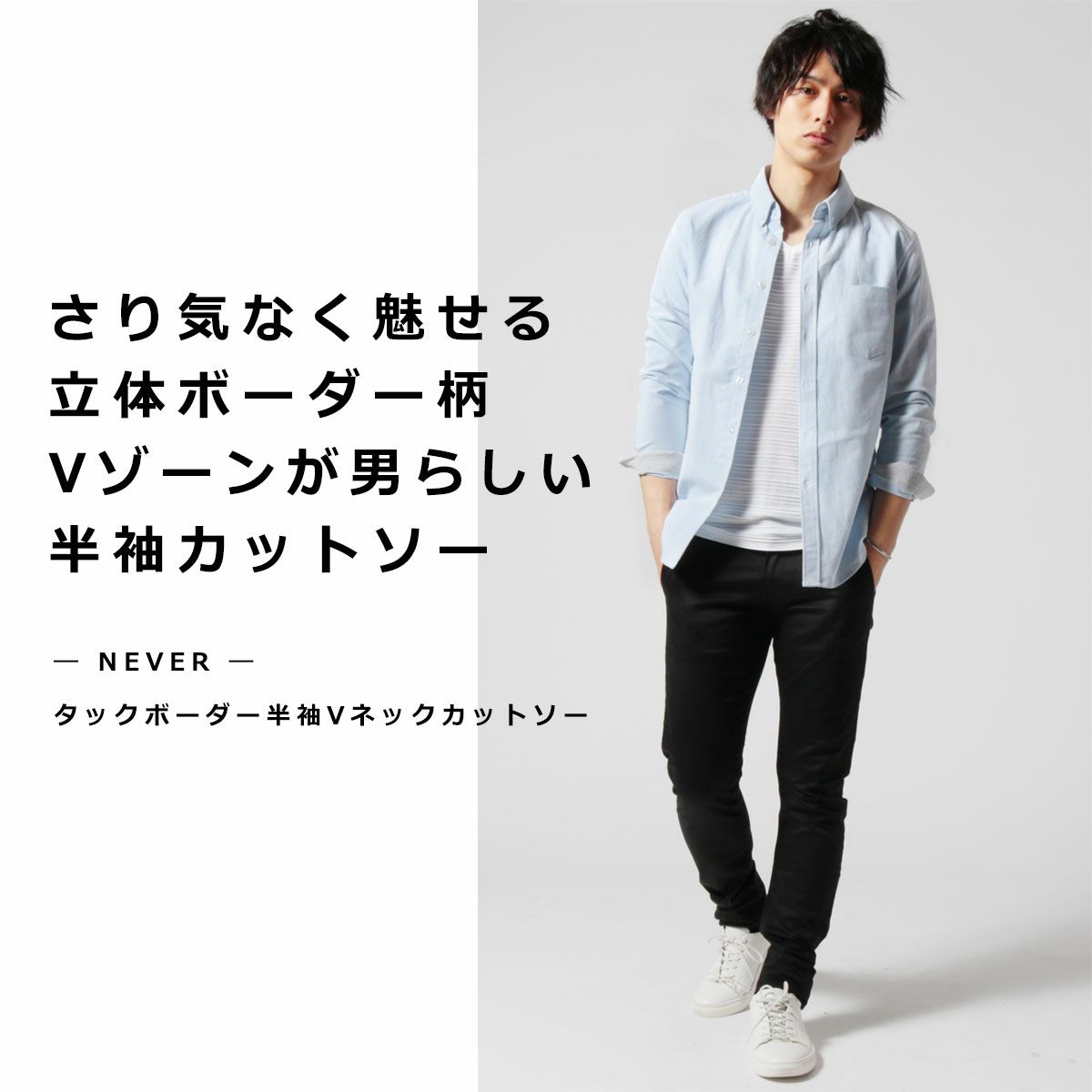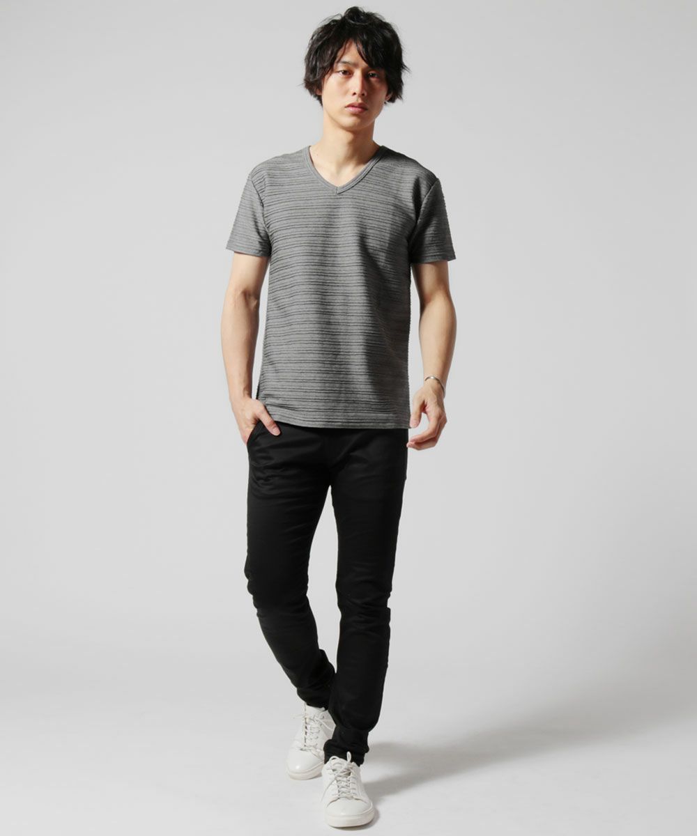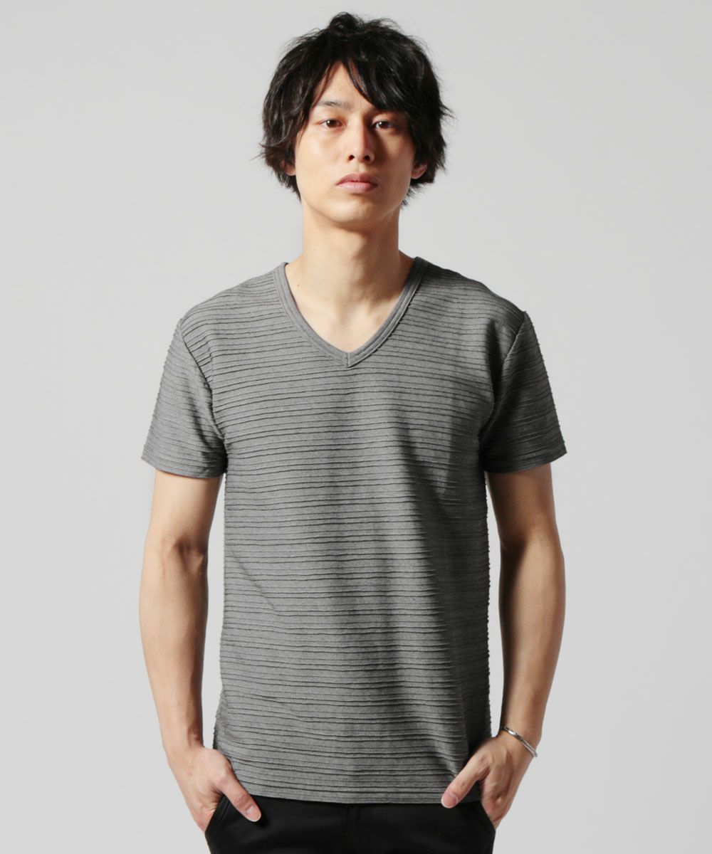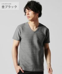 さりげない立体的なボーダー柄とVネックデザインが魅力的なカットソーです。綿とポリエステルを混紡した柔らかい生地が特長。襟元のVネックは鎖骨をチラ見せして男らしい印象を与えられます。