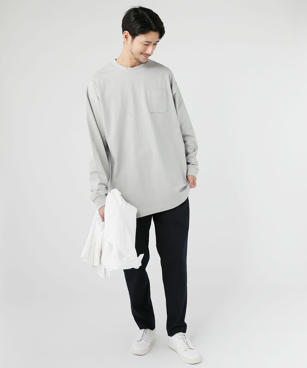 素材には柔らかくて肌触りの良い綿を100%使用し、MVSとも呼ばれる『ムラタ・ボルテックススピナー』という特殊な構造をした糸で編まれたハリ感のある生地に仕上げています。毛玉ができにくいという特長を持っているので、家庭でのお手入れが簡単なのも嬉しいポイントです。ドライタッチな着心地で肌にまとわりつきにくいので、快適な着心地をキープしてくれる一着です。