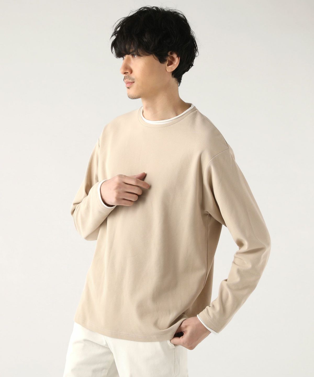 襟元や袖口から白い生地が覗くレイヤード風のデザインが特徴的。シンプルなデザインながら1枚でもバランスの良い着こなしに見せてくれます。