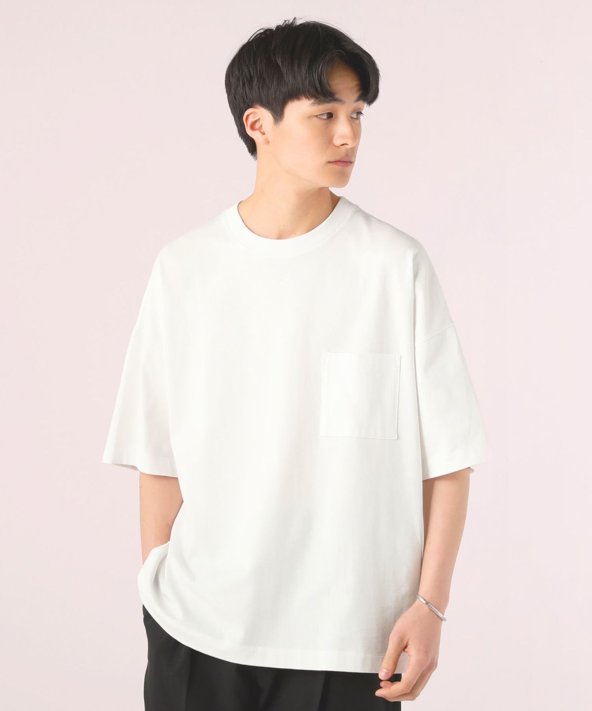 ややオーバーサイズのシルエットとドロップショルダーのデザインが抜け感を演出。 胸ポケットや後ろ身頃の切り替えデザインなどのアクセントを散りばめているため、無地ながらも存在感を放つアイテムです。