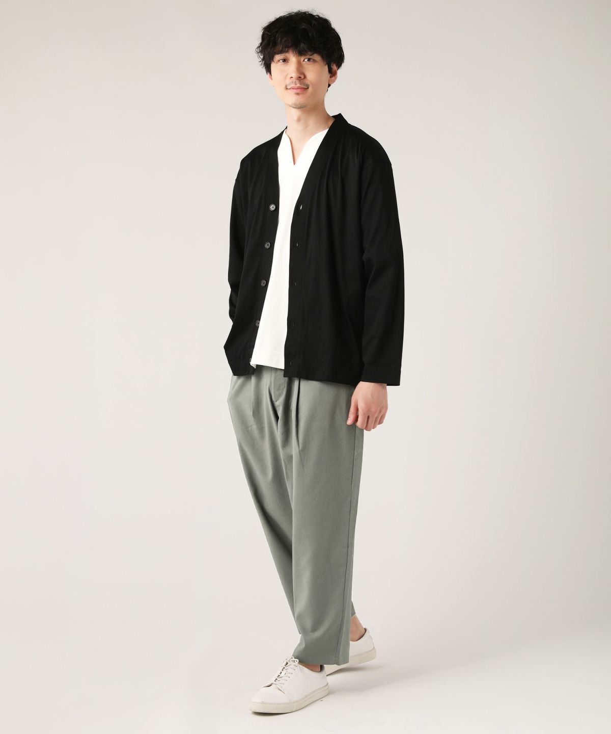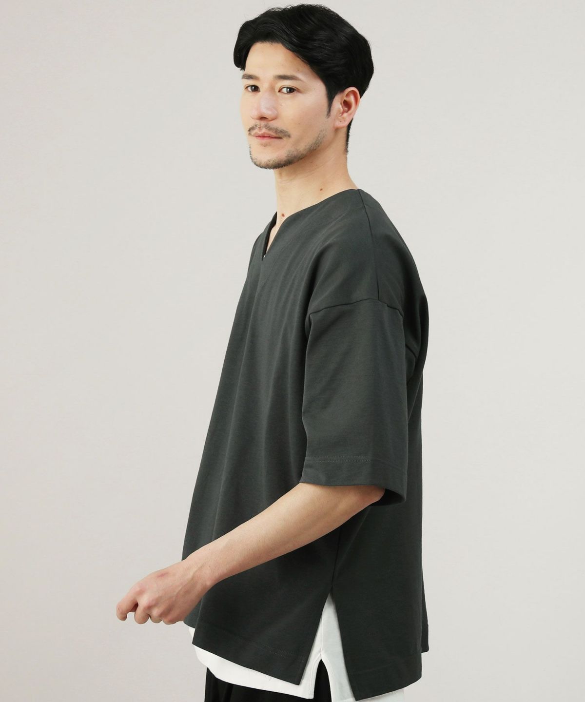 首元はキーネックデザインになっており、深く空きすぎない上品なカットラインが抜け感を演出します。インナーと合わせたコーディネートでは簡単にレイヤードを作ることができ、着こなしの幅を広げる一着です。