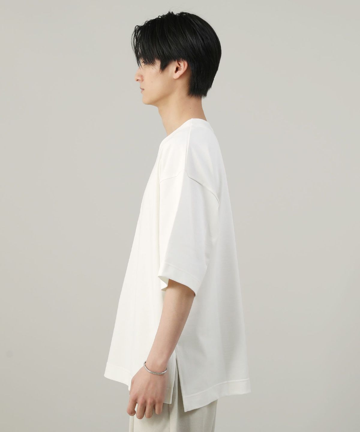 素材にはMVSと呼ばれる『ムラタ・ボルテックススピナー』という特殊な構造をした糸で編まれた、ハリ感のある天竺生地を使用。毛羽立ちが少ないクリアな生地感で毛玉もできにくく、水分を素早く発散して爽やかな着心地を保てるなど、様々な特性を持っている機能素材です。