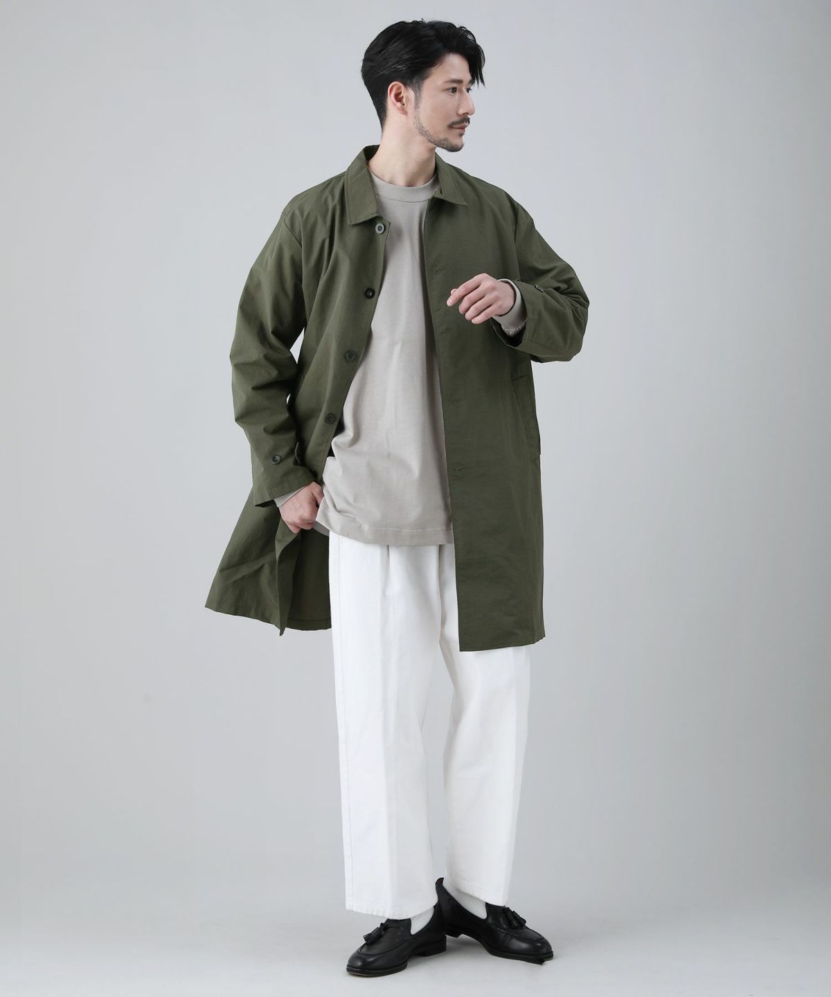 程よくゆとりを持たせたルーズシルエットは、MVSのハリ感により、もたつくことなく上品な印象。前後で差をつけた着丈や浅めのサイドスリット、裾に向かって細くなるテーパードシルエットが程よいこなれ感を演出します。