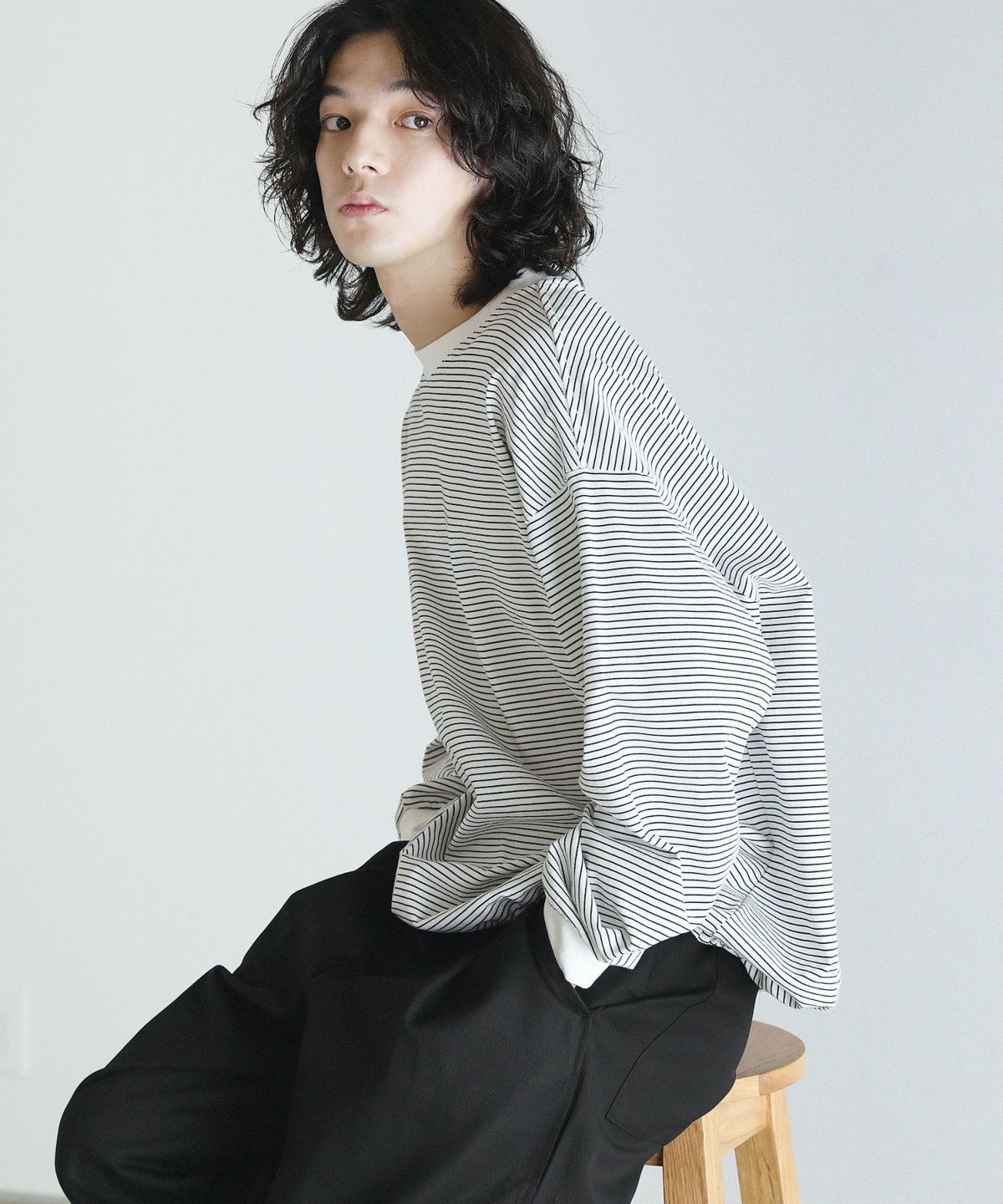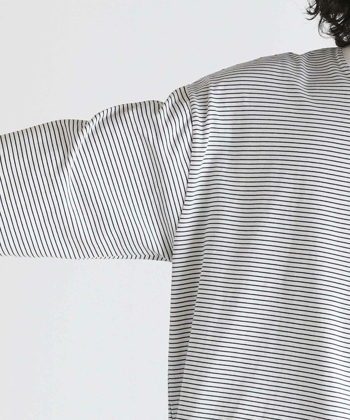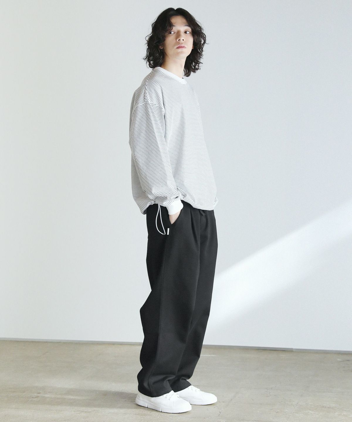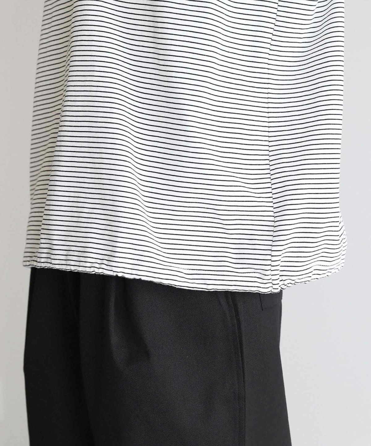 マイクロボーダー天竺を採用した、ドローストリングスTシャツ。 肩の落ちたドロップショルダーと広めの身幅を取ったデザインで、ゆったりとした着心地ながらおしゃれに決まる一着。 細かいピッチのボーダー柄と落ち着いたトーンの配色で、程よいアクセントがありつつクリーンな印象にまとまります。