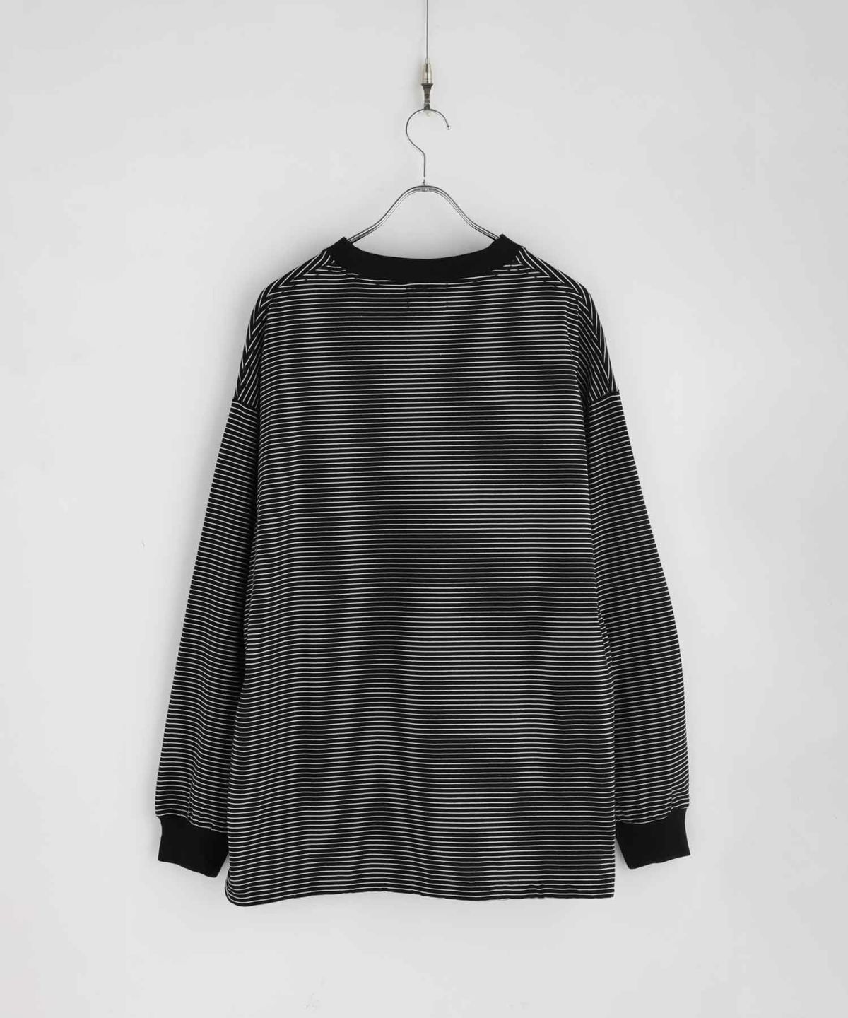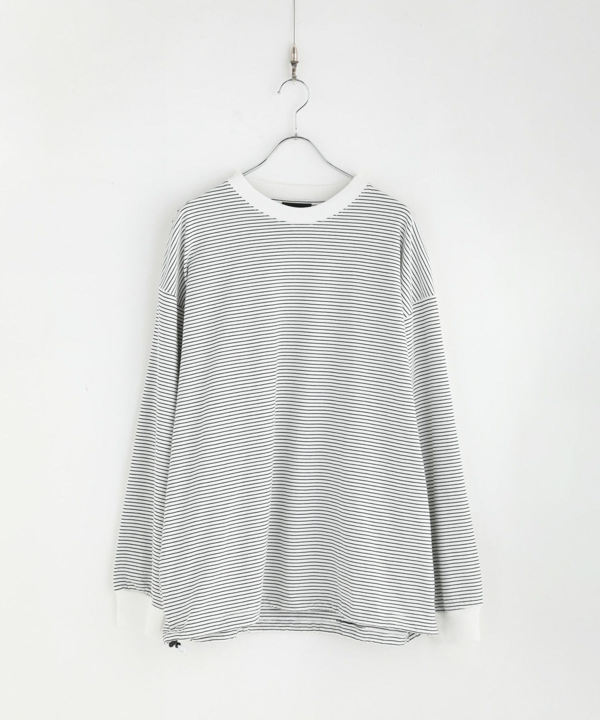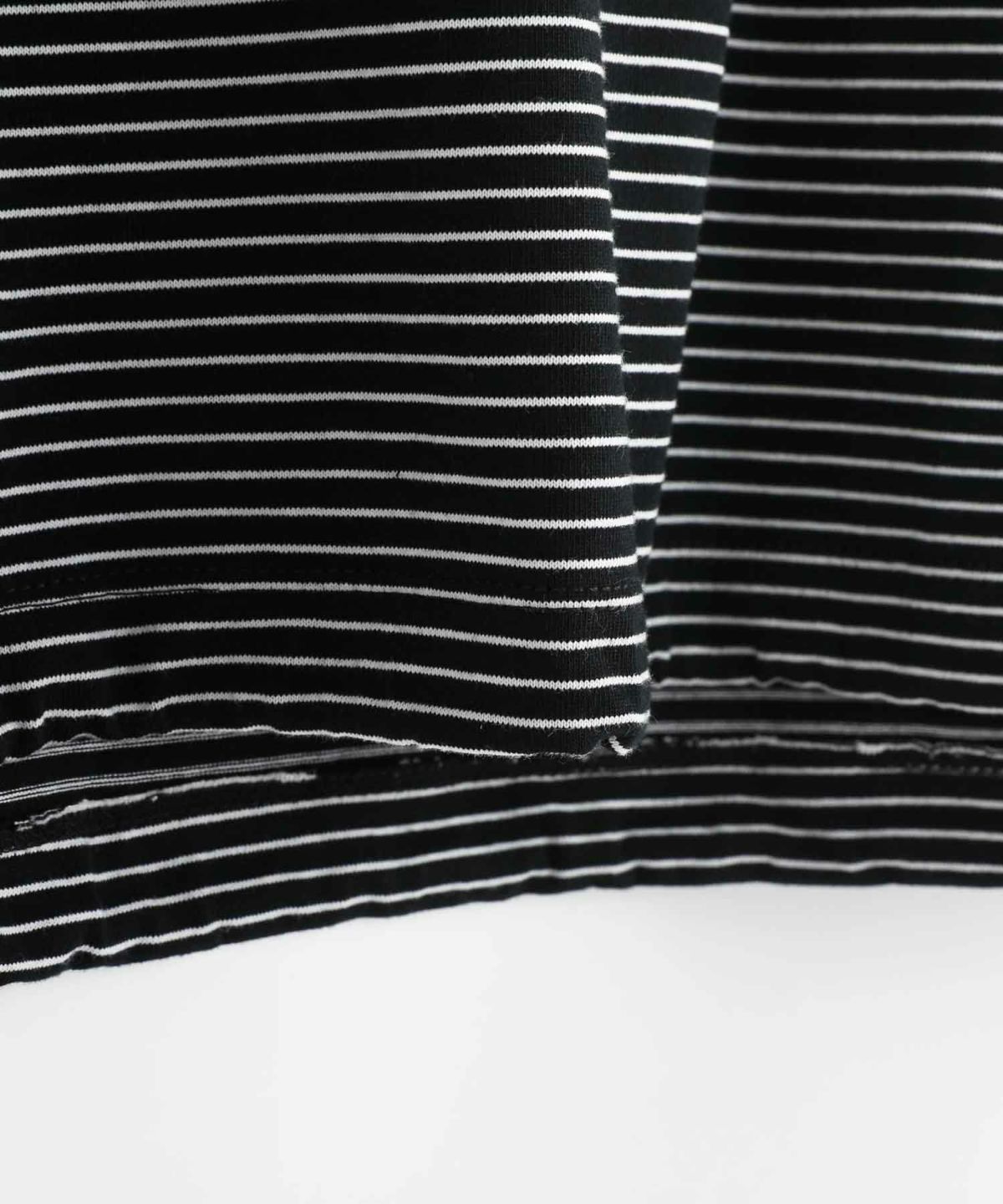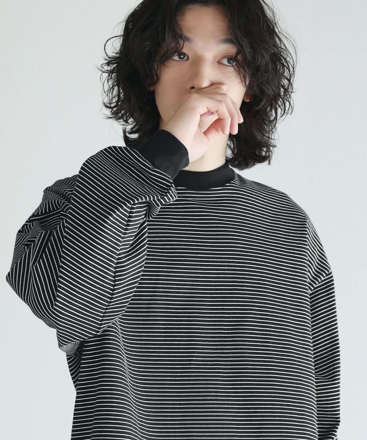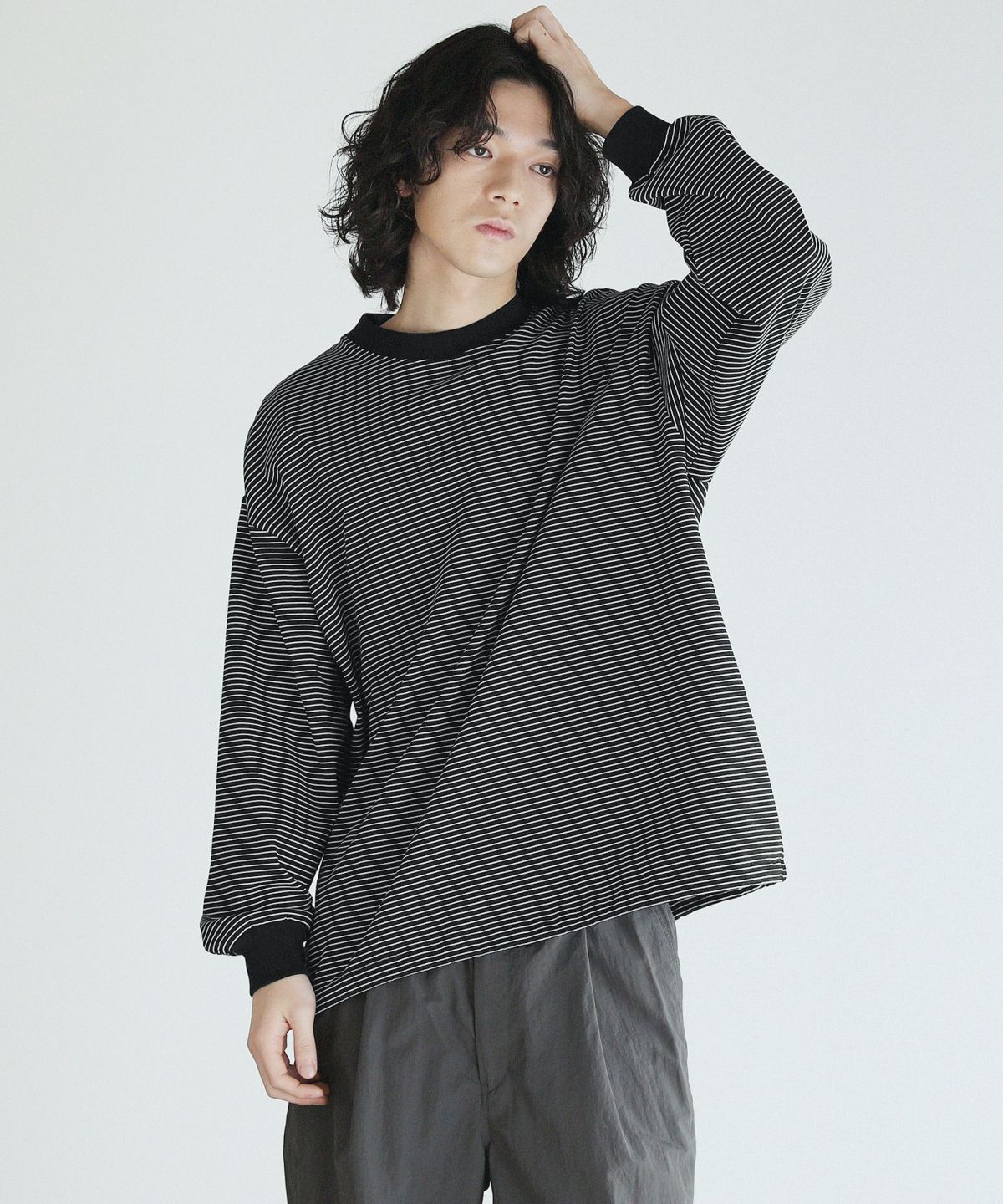 マイクロボーダー天竺を採用した、ドローストリングスTシャツ。 肩の落ちたドロップショルダーと広めの身幅を取ったデザインで、ゆったりとした着心地ながらおしゃれに決まる一着。 細かいピッチのボーダー柄と落ち着いたトーンの配色で、程よいアクセントがありつつクリーンな印象にまとまります。
