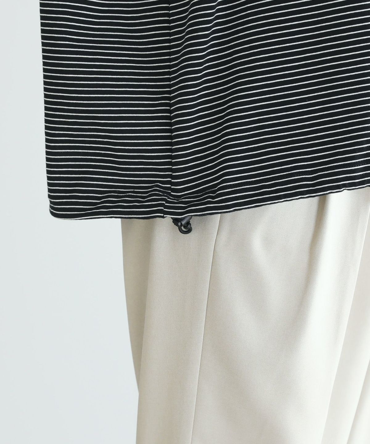 マイクロボーダー天竺を採用した、ドローストリングスTシャツ。肩の落ちたドロップショルダーと広めの身幅を取ったデザインで、一枚使いでもこなれた雰囲気のスタイルに仕上がります。上品な細かいピッチのボーダー柄と落ち着いたトーンの配色で、程よいアクセントがありつつ爽やかな印象にまとまります。