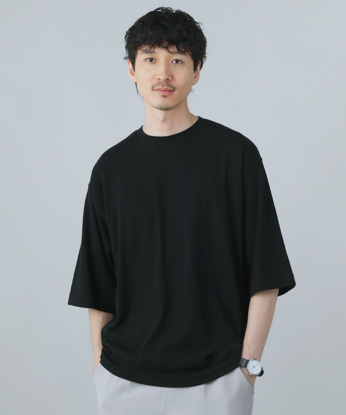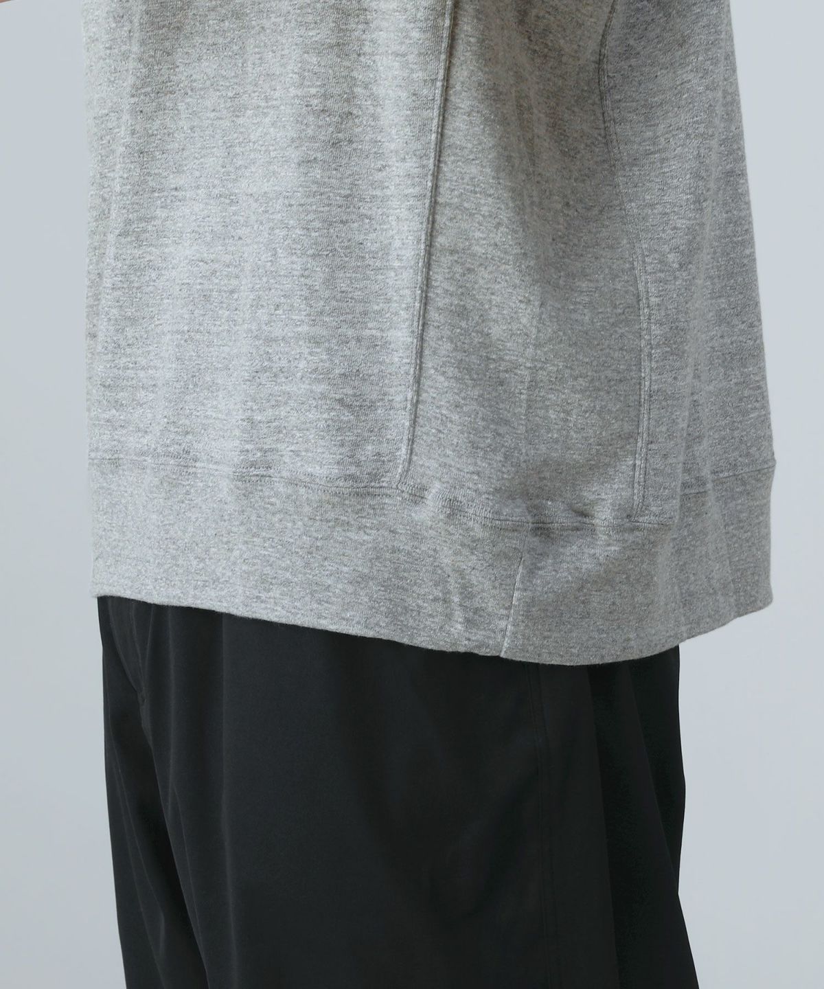 サイズ感はやや大きめに仕上げており、肩の落ちたドロップショルダーと広めに身幅を取ったデザインが今っぽい印象をプラス。袖はゆとりのあるサイズ感に合わせて長めの丈感に設定しており、春先から晩夏まで長い期間ご着用いただけます。首元のV字ガゼット、襟ぐりや裾に配したリブなど、スウェットのディテールを落とし込んだデザインにもこだわりました。