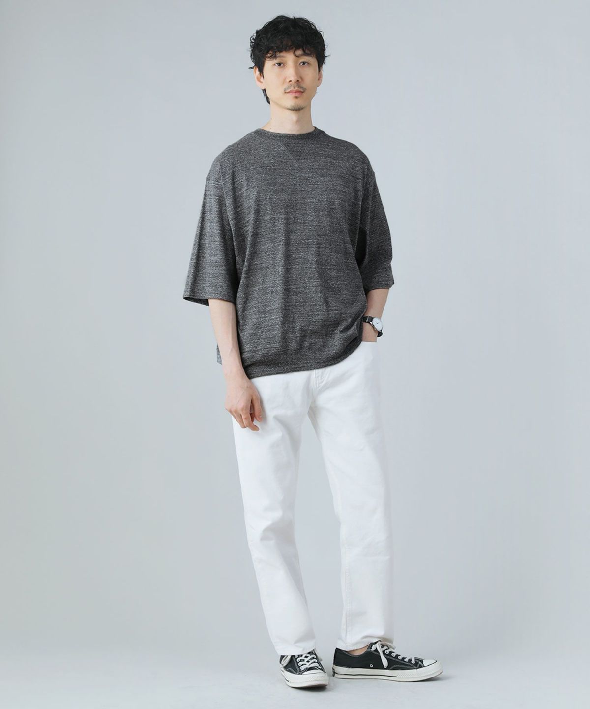 カラーは、ベーシックで使い勝手の良いオフホワイト、ブラックに、糸染や生地染では表現できない杢調が魅力の杢チャコール、杢グレーを加えた4色展開。スラックスやワイドパンツなどキレイめにもカジュアルにも合わせやすく、簡単にラフな大人コーデが完成します。スウェットライクなデザインがこなれ感を与えてくれる、一枚着でもサマになるアイテムです。