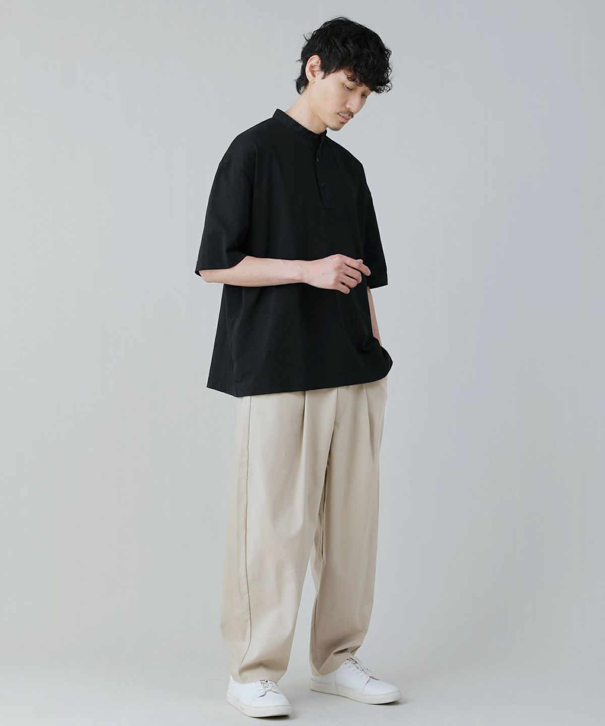 シンプルなスタンドカラーのヘンリーネックTシャツです。