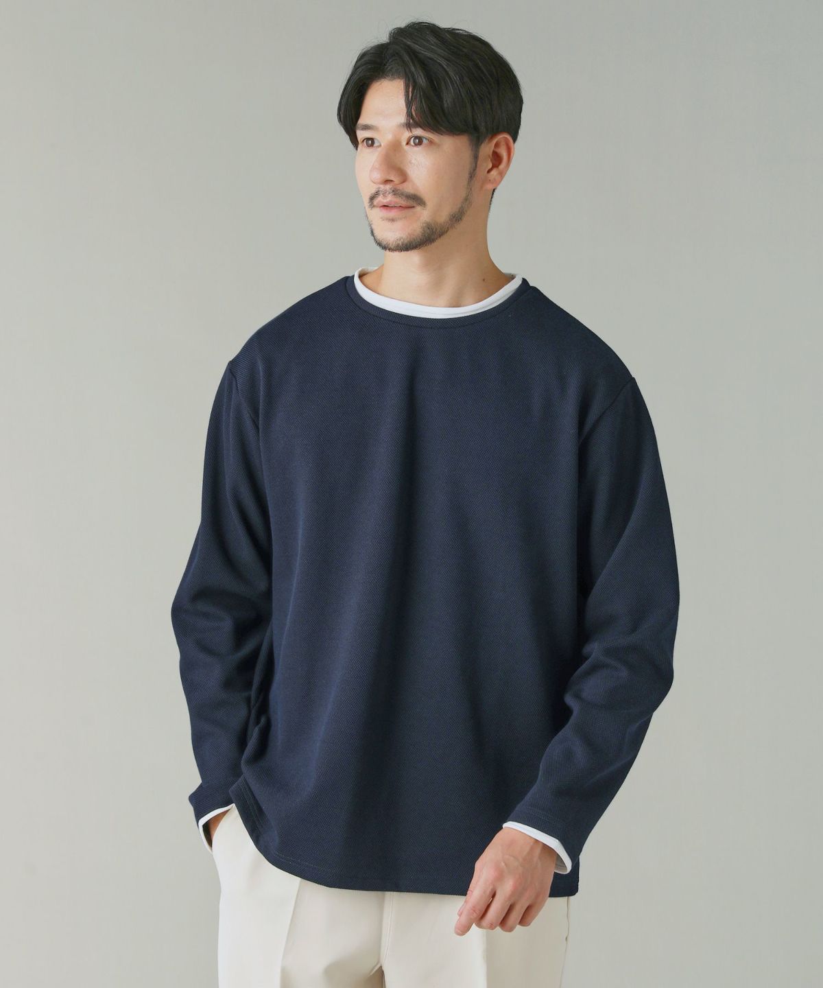 本体の生地には、サラリとした肌触りのポリエステル混紡素材を使用しました。表面は凹凸感のある鹿の子生地でさり気なく表情をプラス。フェイクレイヤード部分は襟元と袖口のみとなっているため、重ね着をしたとき特有のごわつき感がなく快適にお召しいただけます。