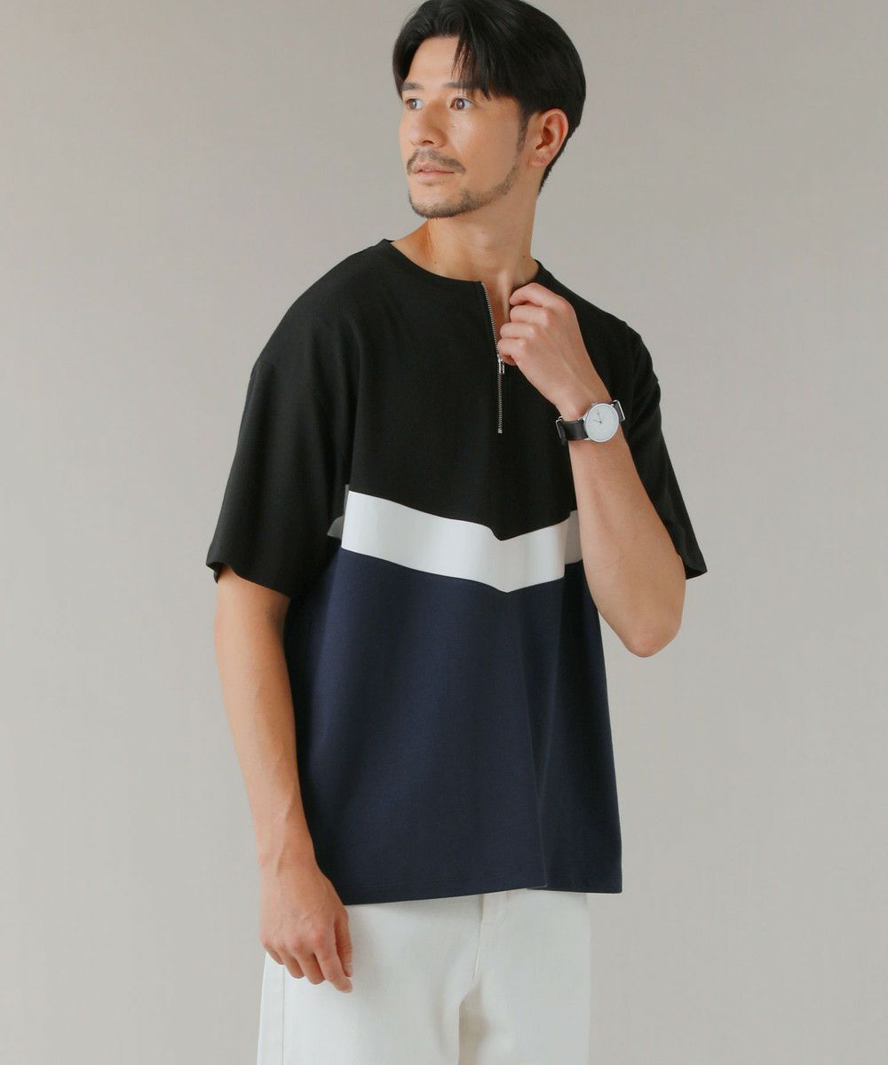 ポンチ×フェイクスウェードVカット切替ハーフジップTシャツ
