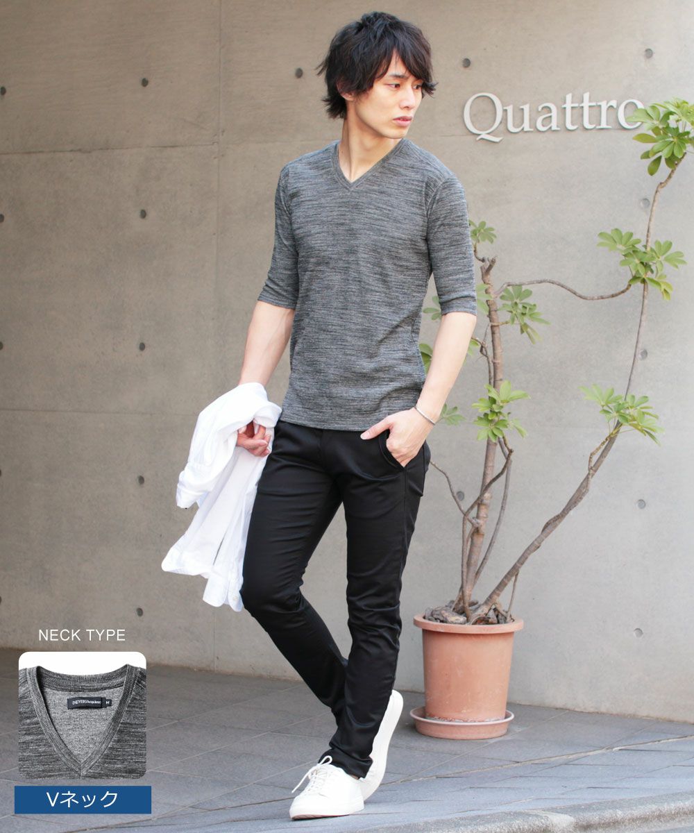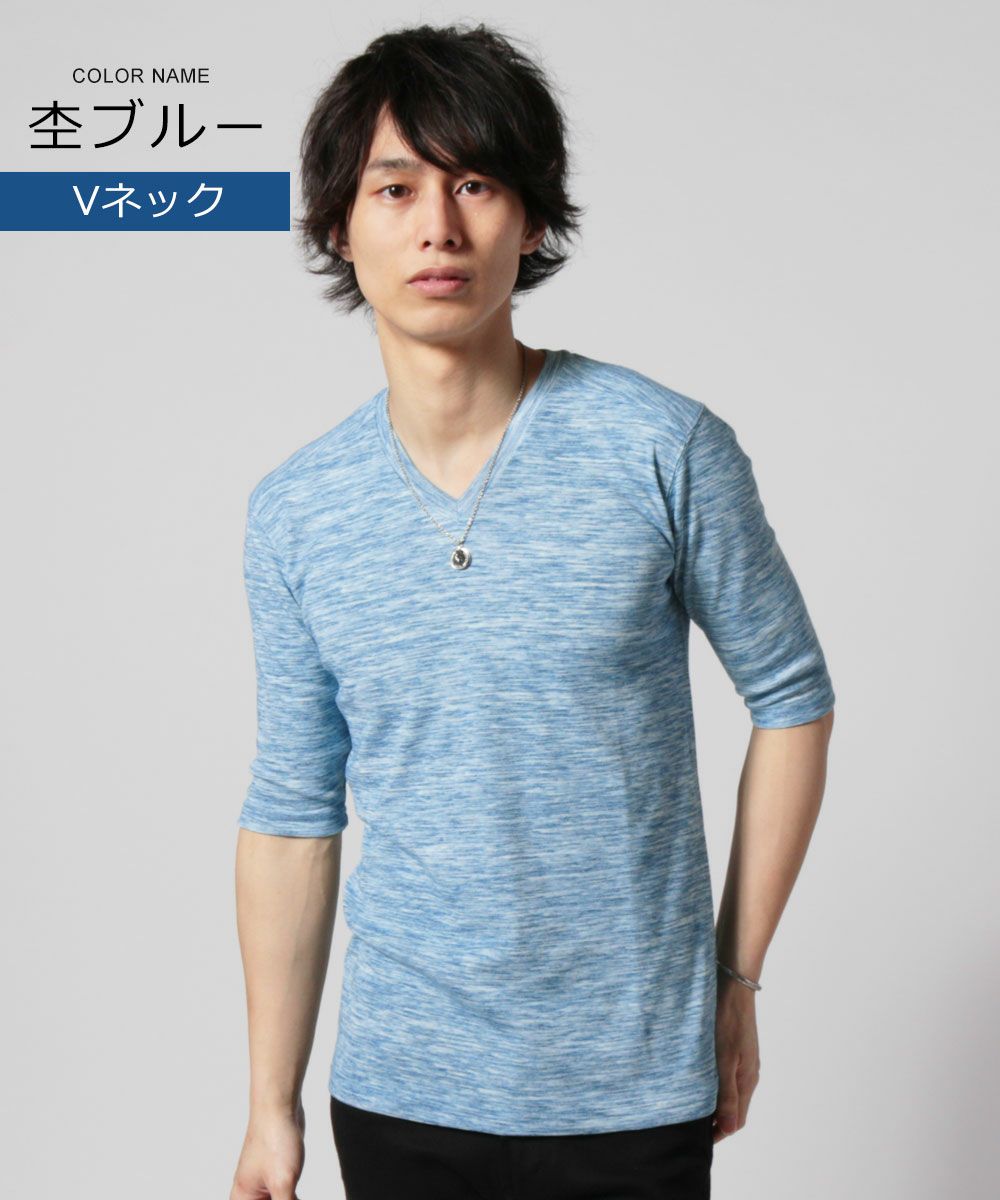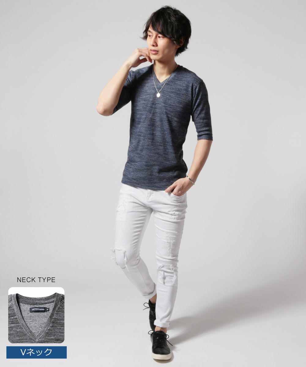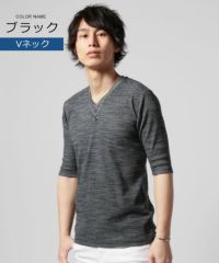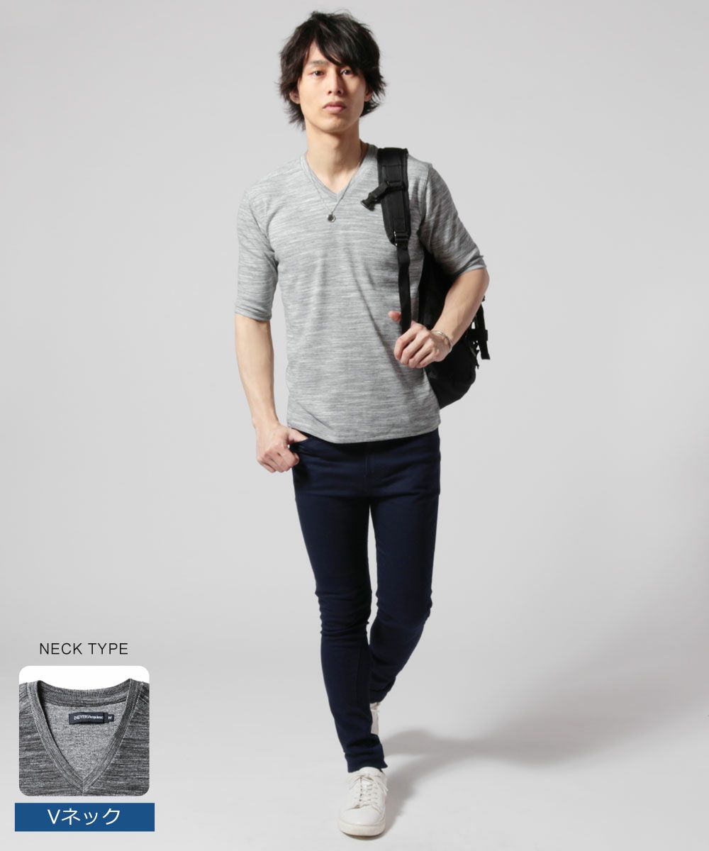NEVERAcquiesce/トリッキーヘザーフライスVネック/クルーネック5分袖カットソー